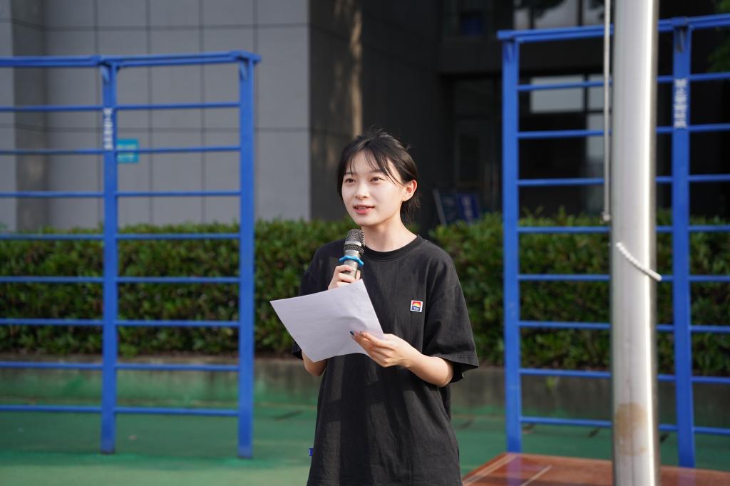 2021级杨佳妮同学作为学生代表在国旗下发言,号召同学们做宪法的忠实崇尚者、自觉遵守者、坚定捍卫者,同时立志做廉洁自律的新时代好青年,让青春在全面建设社会主义现代化国家的火热实践中绽放绚丽之花。