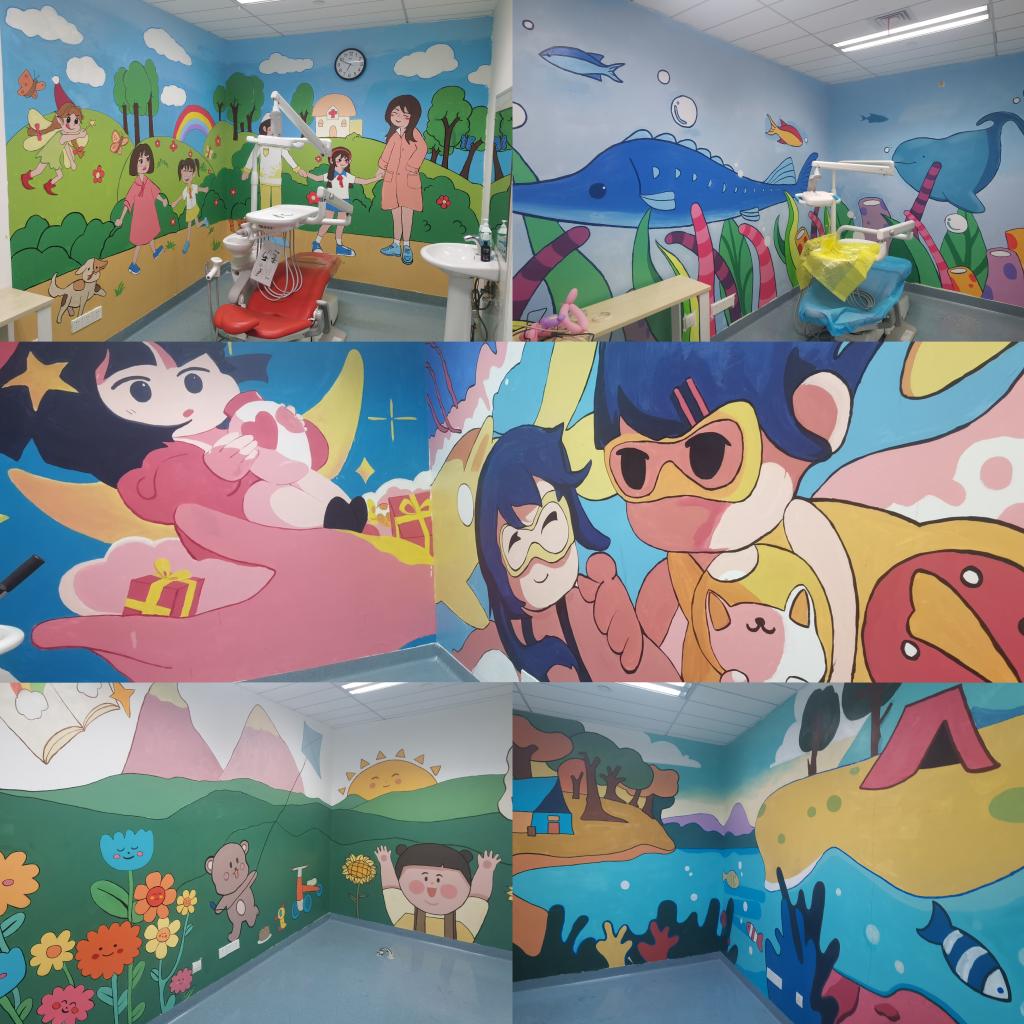 武汉大学人民医院东院口腔科负责人、口腔科党支部副书记佘文婷首先带大家参观了前期由视觉艺术设计学院晨曦公益美育志愿服务队设计绘制的儿童诊疗室墙绘作品。佘书记对晨曦的志愿墙绘活动表示感谢,并表示口腔诊疗室墙绘公益活动得到了医院领导和前来就诊患者们的一致好评,美化了诊疗环境,为口腔科增添了生趣和活力。