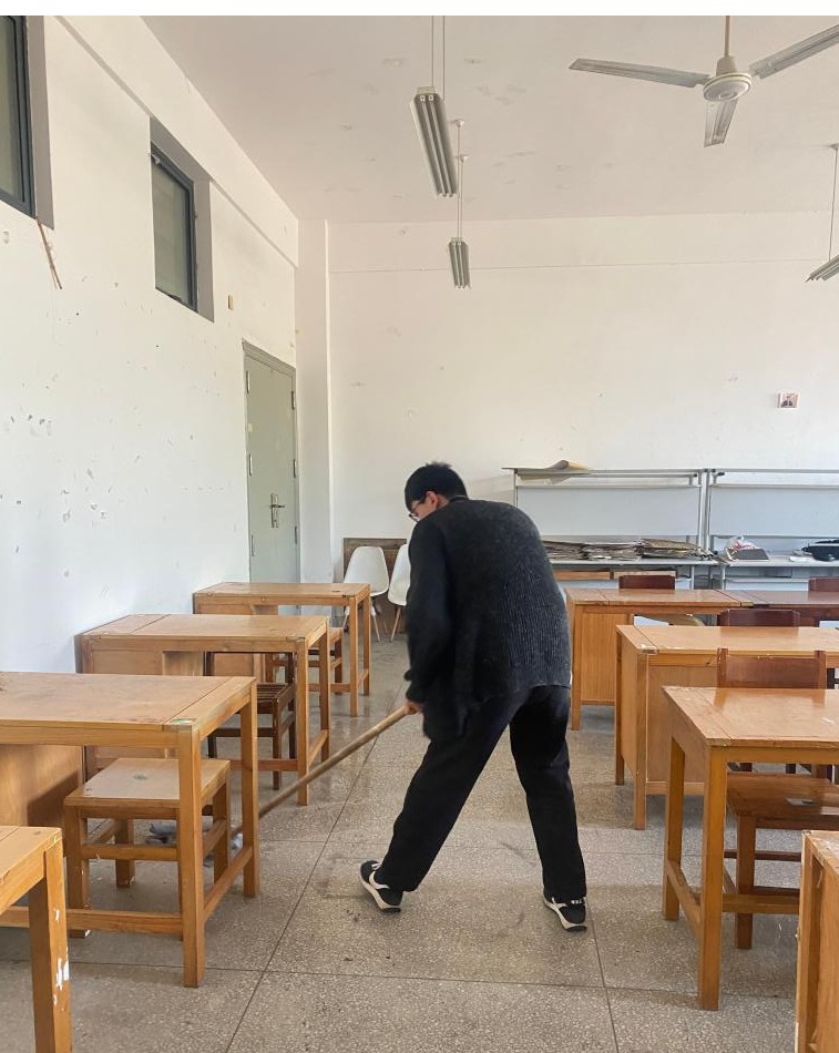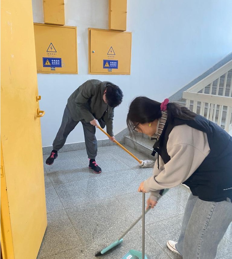 志愿者们齐心协力,互帮互助,利用手中扫帚、抹布、水桶、垃圾袋等清洁工具将教学楼地面、墙面、桌面、窗户打扫得一尘不染,将桌椅板凳收拾得干净整齐,学院面貌焕然一新。