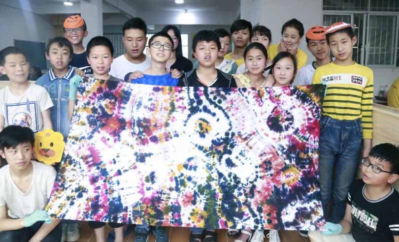 在这周时间里,志愿者给孩子们上了三大传统课程:扎染、版画、黏土动画。每年的支教中这三大传统课程都是不可缺少的,志愿者们在以往的基础上有了新的创新。因为扎染所需布料存在质量问题,所以志愿者们用滴染的方法完成了扎染课程。版画需要用锋利的工具进行雕刻,为了避免孩子们雕刻划伤手,对于不同年级的孩子采用了不同的材料,大班为木板雕刻、小班为塑胶板雕刻。在扎染课程中,孩子们对扎染表现出了浓厚的兴趣。最为心喜的是小班在扎染过程中,还自发的排起了长队。