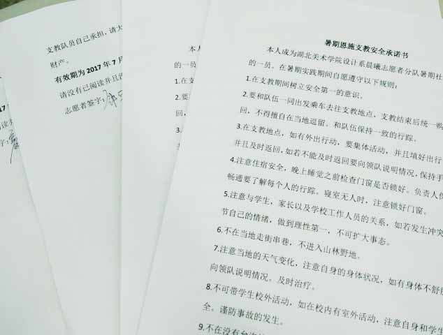 (通讯员:钟思英 摄影:钟思英)2017年7月2日星期日下午五时,设计系晨曦志愿者分队于武汉市江夏区湖北美术学院藏龙岛校区A9教学楼203教室开展了主题为“暑期恩施支教安全承诺”的会议。此次活动由设计系晨曦志愿者分队主办,共有恩施支教成员9名,其中包括晨曦志愿者分队3名,外招志愿者6名。