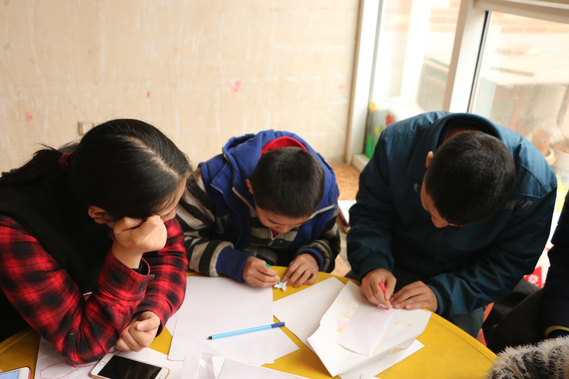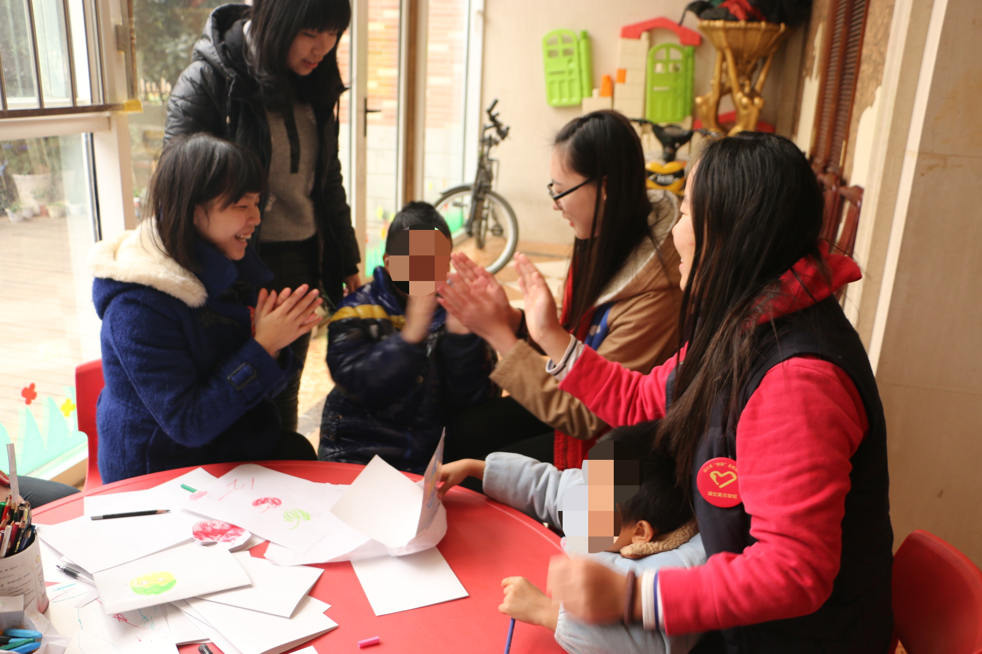 早上9时许,志愿者们便到达了禧乐儿童康复中心,一进门便得到了孩子的热烈欢迎。准备工作全部妥当后,志愿者们立即投入到了忙碌的支教工作中。根据每个孩子的喜好不同,授课过程分为两组,一组教孩子们画画,另一组则教孩子们做手工。志愿者们根据分组,把大家精心准备的课程教授给孩子们。教孩子们画贺卡的小组收获颇丰,他们首先用图画的方式进入孩子们的内心世界,让孩子们愿意对志愿者们敞开心扉;然后引导着孩子们在卡纸上画下他们喜欢的物品,创作了一张又一张饱含着大家的爱心的贺卡。而折纸小组也毫不逊色,大家都心灵手巧,根据孩子们的要求用一张张白纸与孩子们一起折出了活灵活现的各个可爱的小物品,有纸鹤、纸船、火箭、兔子、青蛙......整个教室内一片欢声笑语。