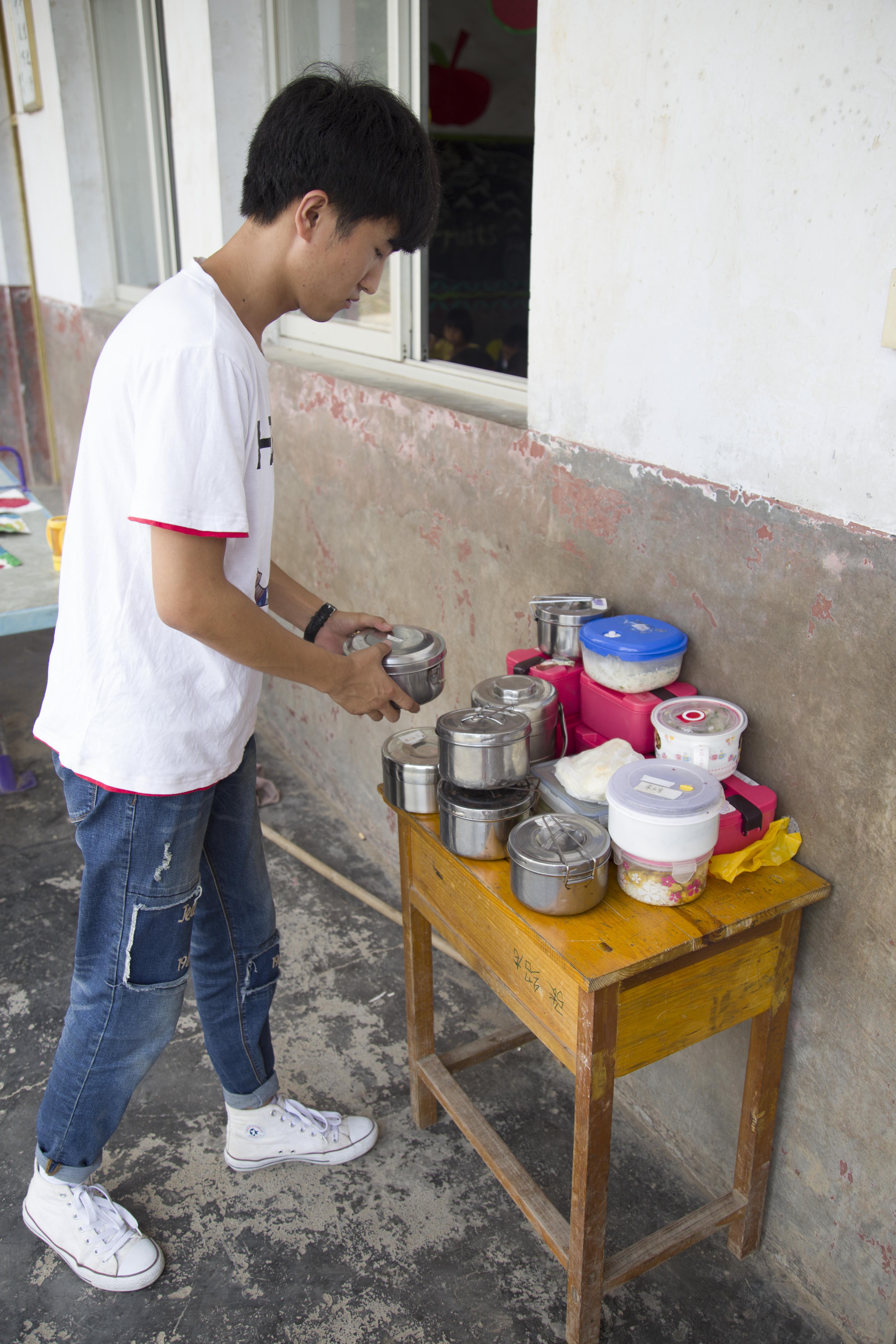 这边的孩子大多是留守儿童,有很多父母都在外地工作,都是爷爷奶奶送来上课的。他们之间有的还是从白杨坪镇其他的村来到九根树村参加夏令营活动,这也就意味着这些孩子在每天清晨天还未亮时就要开始朝学校出发,走一个多小时的山路过来上课。所以在每日中午的进餐时间,住得近的孩子们会有家长送来热腾腾的饭菜,而其他住得远的孩子们只能自己带饭盒来学校,志愿者们则会帮他们统一加热,再发给他们吃。看着那些蜿蜒曲折的盘山小路,看着那些被加热过一次又一次的饭盒,看着孩子们脸上天真烂漫的笑容,我相信志愿者们内心也一定感触良多。