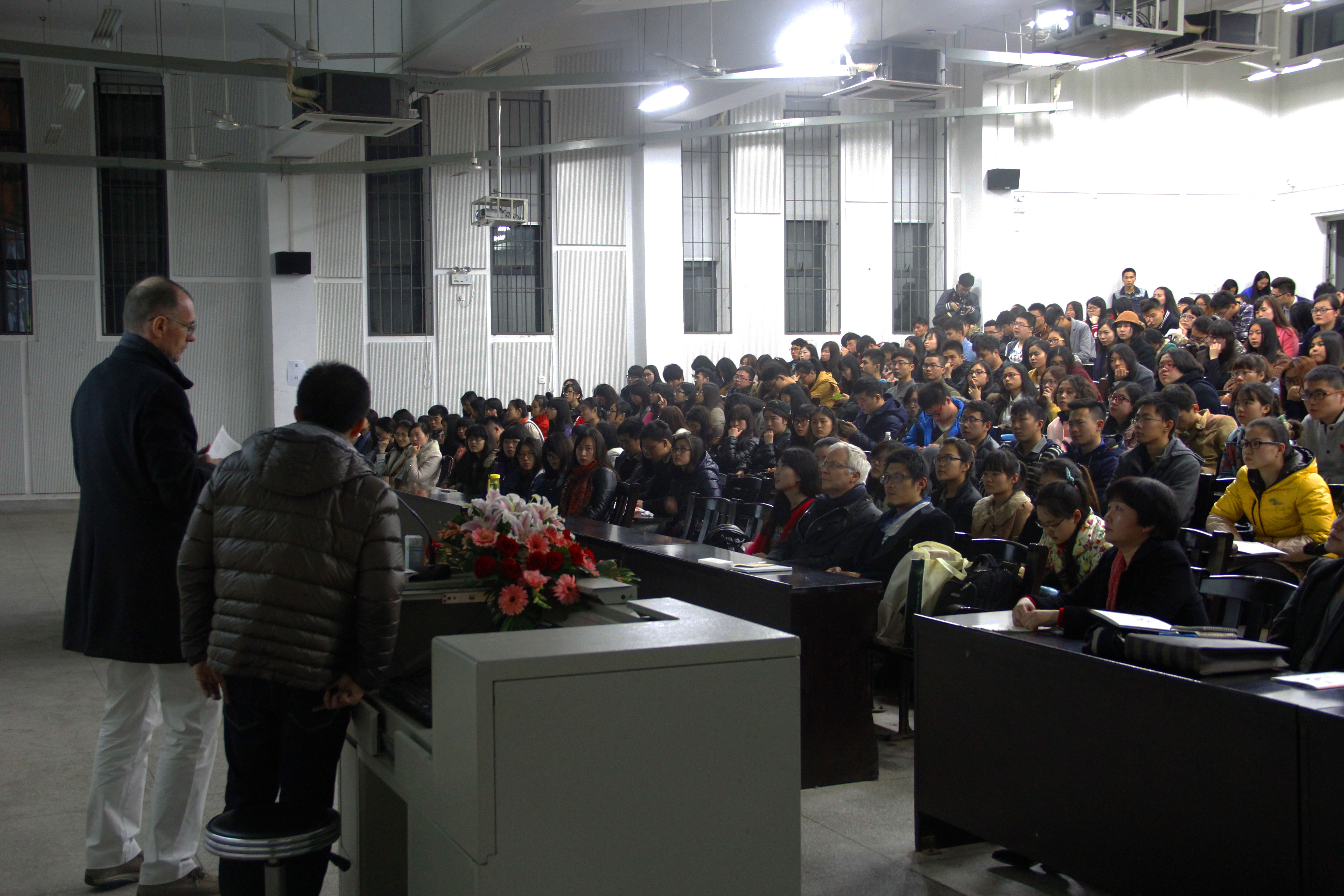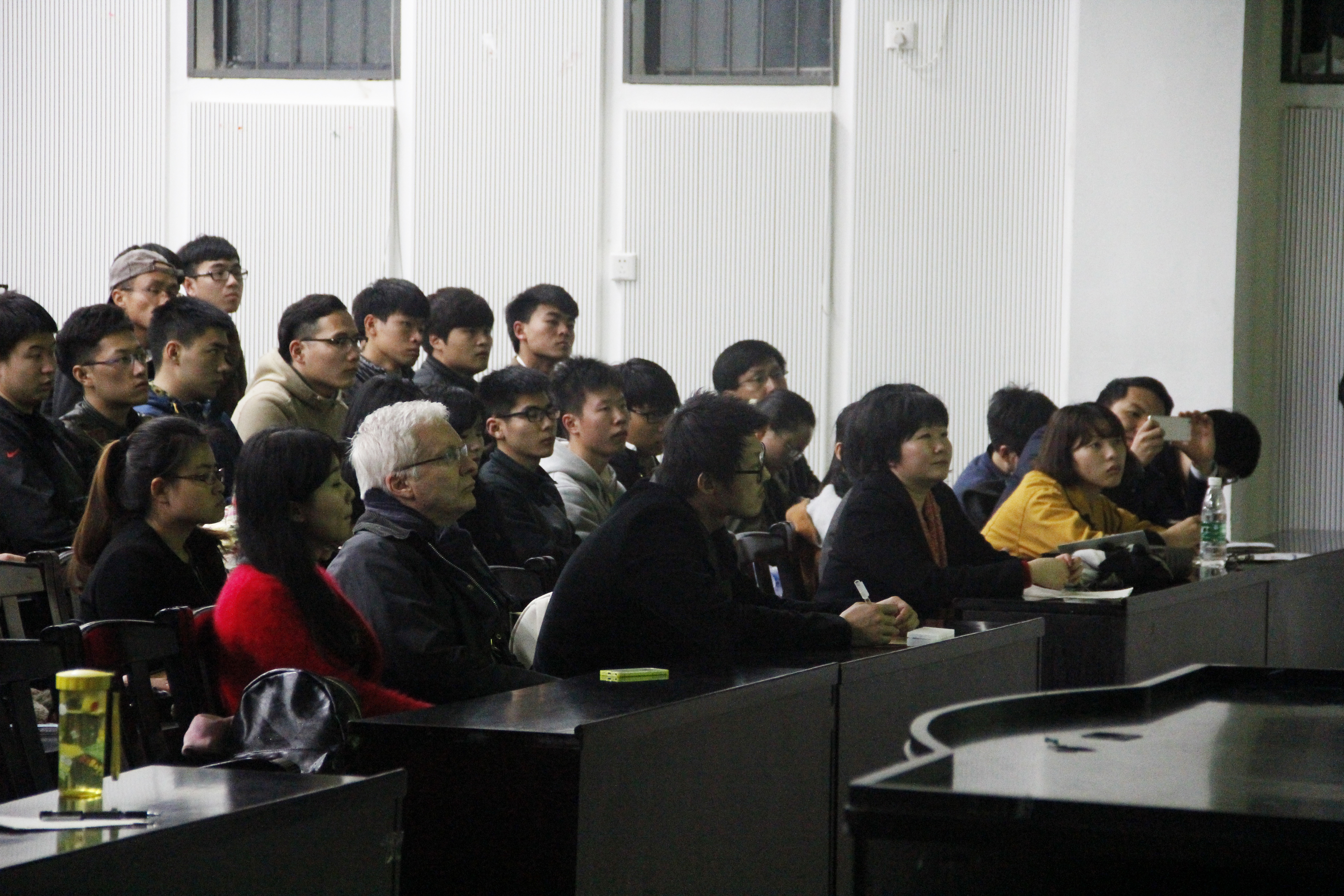 教授精彩的讲座赢得一次次潮水般的掌声,讲座最后也留出一部分时间给同学们进行提问,不少高年级的学长学姐们还纷纷秀出自己流利的英语与教授交谈。设计与艺术一样不分国界,设计的理解与思维同样需要交流,环保又是全人类永远的主题。设计营造绿色地球,绿色地球为设计营造良好环境,两者相生。希望在这些未来设计师的手里能出现更多绿色的设计,日后的夜空能长是繁星,大地满是青翠,空气能长是清新。