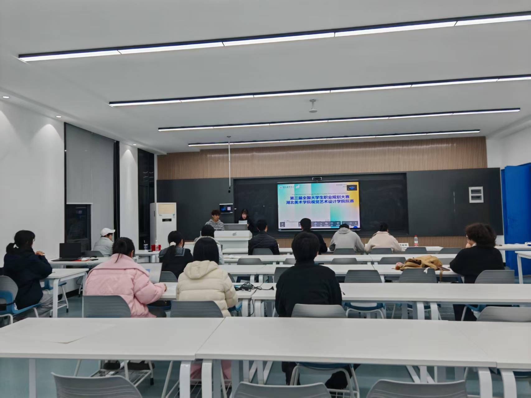 为深入贯彻落实党中央、国务院关于高校毕业生就业工作的决策部署,引导学生树立正确的成才观、职业观和就业观,科学合理规划学业与职业发展路径。2025年11月20日下午6时,视觉艺术设计学院在藏龙岛A9教学楼206教室及黄石基地同时举办第三届全国大学生职业规划大赛院级选拔赛。学院党委书记袁秀娟莅临比赛,学院辅导员柳骏、张志强、方玲珠、唐瑜琦老师,及特邀嘉宾王旺校友担任赛事评委。HIFA成才之路工作室承办本次赛事,全院共计220余名学生报名参赛,经遴选,8名优秀学子进入院级初赛同台竞技。