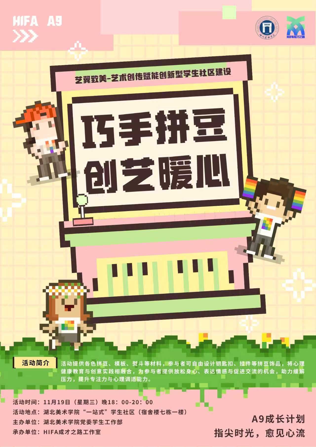 11月19日晚上,为丰富同学们课余生活、提升专注力与创造力,视觉艺术设计学院学生会依托“一站式”学生社区举办“巧手拼豆,创意暖心”DIY活动,20名同学参与其中,在拼豆手作中放松身心,感受创意表达的快乐。