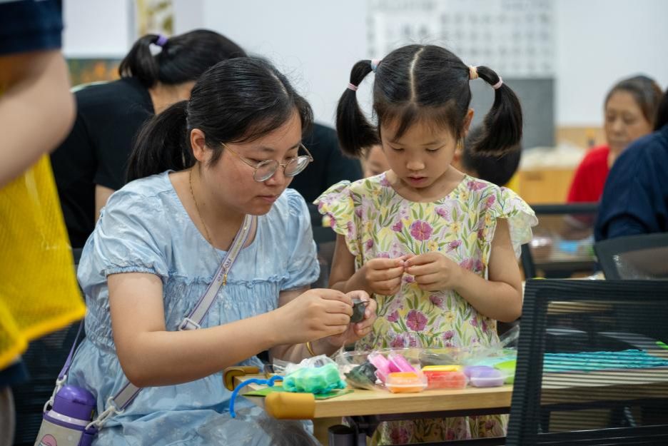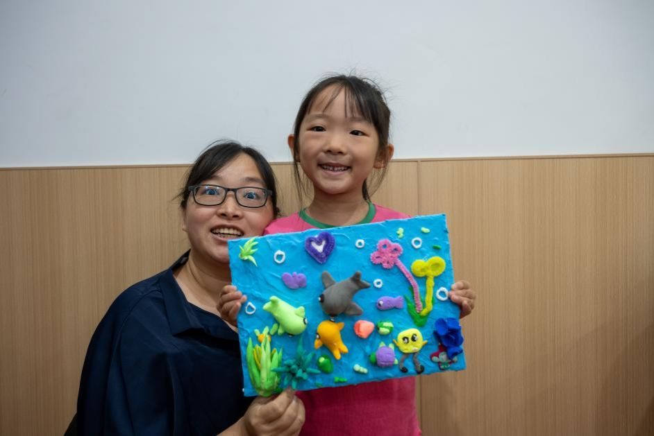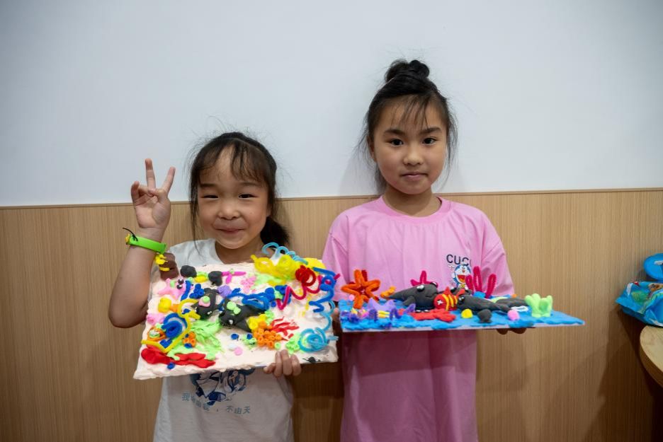 了解是保护的第一步,创作则是情感的升华。在亲子共创环节,孩子们与家长一起动手,利用环保粘土和硬纸板,共同构建心中的“江豚乐园”。小手专注地捏出圆润的江豚身体,点缀俏皮的表情;家长们则协助搭建河流、水草等场景。五彩斑斓的作品很快铺满了桌面——粉色的梦幻河流、欢快嬉戏的江豚家族……孩子们天马行空的想象力,将环保理念具象化为充满童趣的艺术世界。