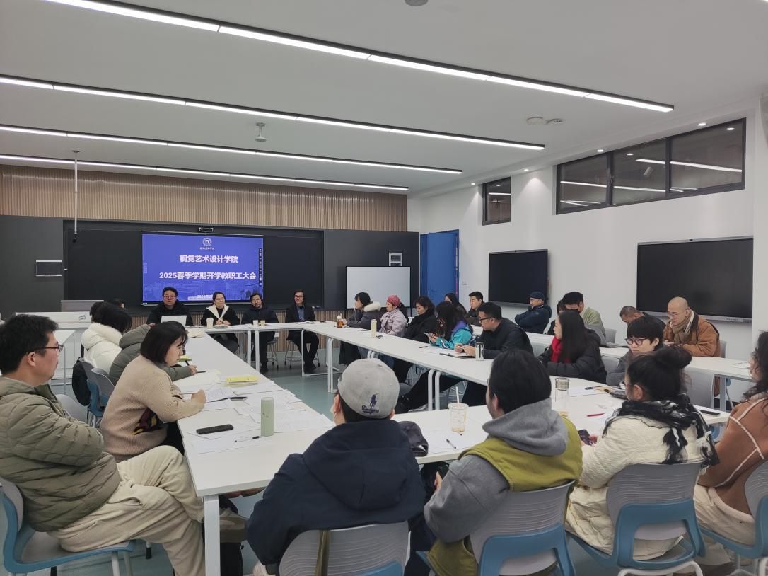 2025年2月20日下午,视觉艺术设计学院在A9-206室隆重召开新学期全体教职工大会,深入学习学校中干会会议精神,全面部署新一年重点工作。会议以“执艺攻坚 拓界致远”为主题。副校长张炼、学院领导班子及全体教职工出席会议,会议由副院长朱志平主持。