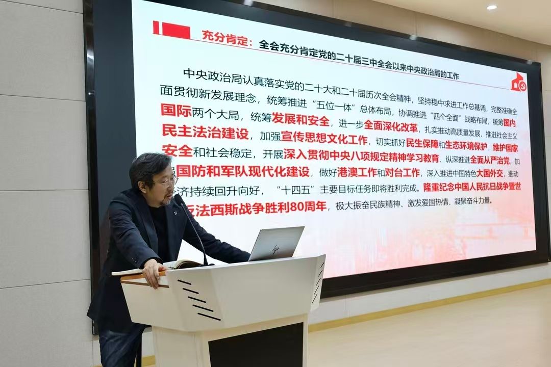 随后,张炼副校长聚焦全会公报重点内容,深入解读了“十四五”时期我国经济社会发展取得的重大成就,并着重分析了“十五五”时期作为基本实现社会主义现代化关键阶段的战略定位。他指出,“十五五”是我国夯实现代化基础、全面发力的重要五年,必须坚持党的全面领导、人民至上、高质量发展、全面深化改革、有效市场与有为政府相结合、统筹发展和安全等六大原则,锚定高质量发展、科技自立自强、进一步全面深化改革、社会文明程度明显提升、美丽中国建设、国家安全巩固等经济社会发展七大目标。通过条分缕析的政策解读,使师生对国家未来发展方向和重点任务有了更加清晰、系统的认知。