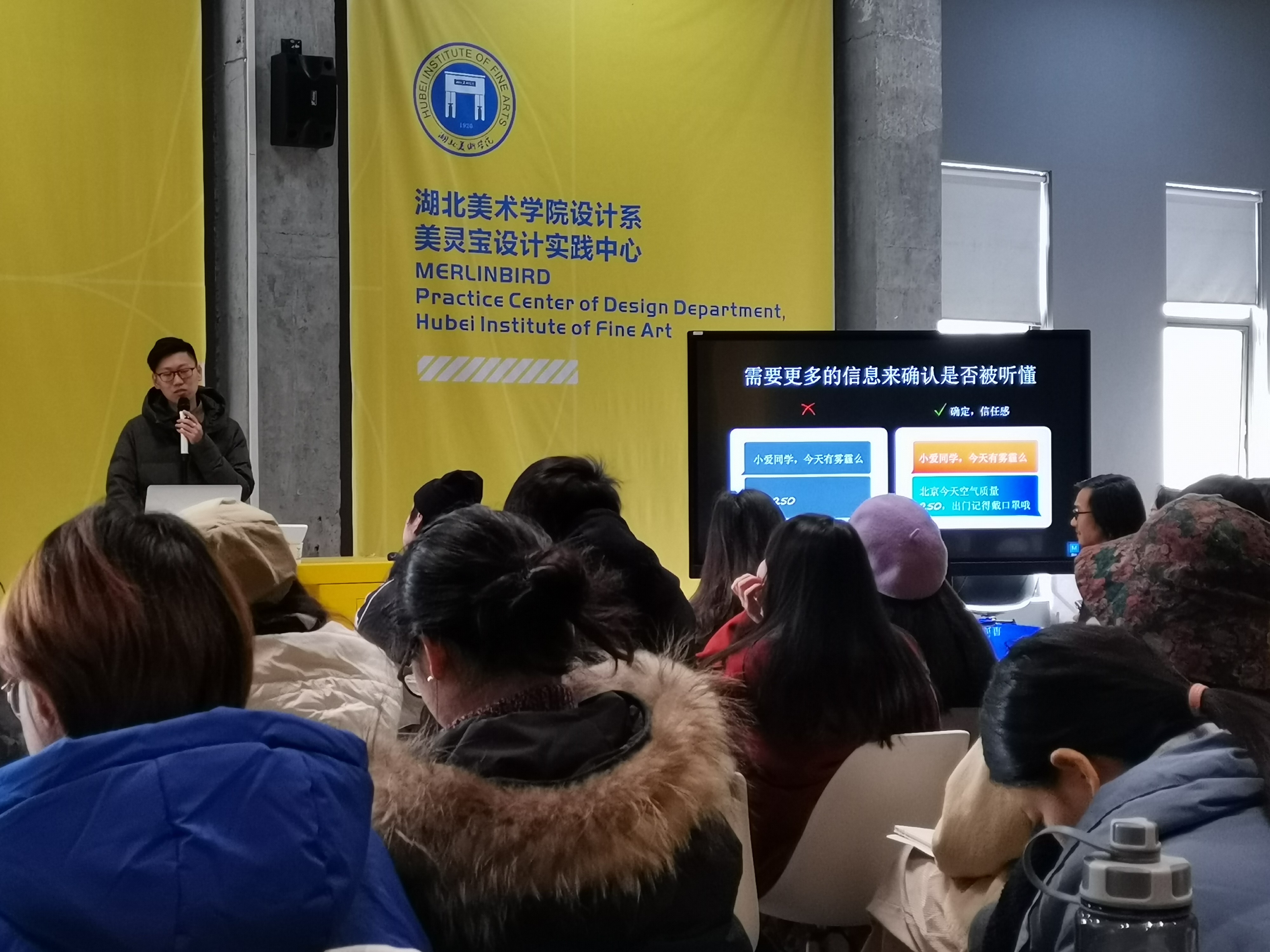 首先南迪尔先生向同学们介绍了他所主要负责的小米AI音箱、小米VR以及小米路由器的体验设计,他们主导设计的小米语音交互体系设计获得了众多国际设计大奖。南迪尔指出了唤醒词是VUI的第一接触点,如何高效优雅的服务大众才是智能AI的初衷。他着重的讲述了人工智能“AI”小爱同学的诞生过程,仅仅是一个简单的名称都是经过了众多讨论筛选,从其传播,唤醒,实用等多方面进行考虑,最后才得出这个名字。还介绍了小爱同学与使用者之间的关系设定和人物形象设定,以及智能硬件体验链条的过程展示图。随后南迪尔展示了小米的FUI设计理念,小米FUI的设计流程主要借鉴影视和游戏,再加上先进的渲染技术,在软件中心中为了提高预览效率选择使用户更能体会到游戏的乐趣及画面的感受采用了全景预览。在FUI的界面上,南迪尔用钢铁侠里FUI的例子说出FUI界面不是越多越好,焦点锥才是引导设计的关键。讲座最后,南迪尔与提问教师、学生进行了问答互动,严谨又不失幽默的解答了师生们提出的问题。