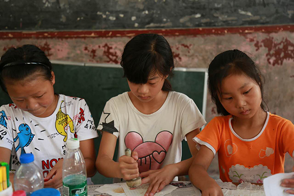 根据往年的经验,今年志愿者们在课程的设计上又做出了很大的改变,针对孩子的年级来对课程进行了相应的调整。今年更是将课堂搬到了户外,志愿者们和孩子一起采集草木染所需的树叶,在这个过程中孩子们既体验到了自己收集作画材料的快乐又收获了制作草木染的技法。在夏令营中志愿者们一直追求让艺术能够真正的进入到孩子们的生活中去,为此志愿者们也是做出了不断的努力,不仅仅是在绘画的原材料上贴近生活而且在题材的选择上也是采取孩子们生活中的故事作为剧本或者绘画元素。作为支教志愿者我们能够陪伴这些孩子的时间有限,更多的时间需要孩子们能够自己去发现他们生活中的美,从而充实自己的生活。