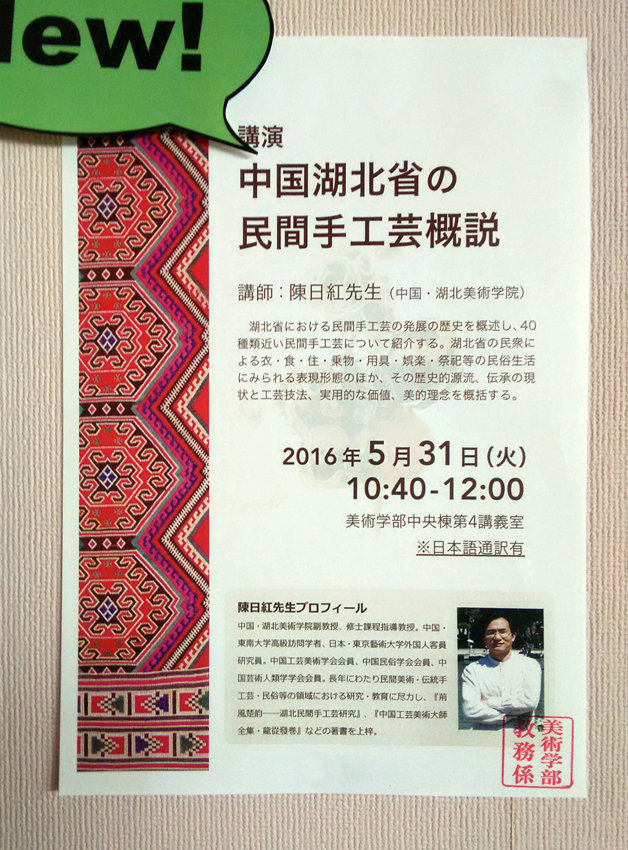 据悉,陈日红是东京艺术大学诸多外国人客座研究员(访问学者)中,为数极少受邀公开举办讲座的学者。东京艺术大学是日本唯一的国立艺术大学,其综合实力位居日本艺术院校之首。其美术学部前身为创始于1887年的东京美术学校,建校之初设立的绘画和工艺专业100多年来一直是该校优势学科。我国近代艺术先驱李叔同先生(弘一法师)曾于1911年毕业于该校绘画科,近代设计先驱陈之佛先生于1920年成为该校第一个工艺图案专业外国留学生。东京艺术大学工艺史研究室历史可溯至百年前,陈日红为该研究室第一个外国人客座研究员。