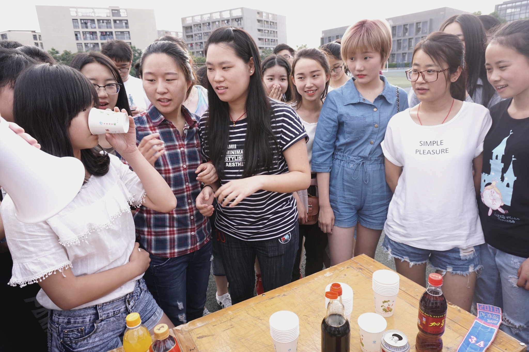 与传统运动会不同,趣味运动会用3个活动项目把娱乐和竞技结合,充分展现同学们团结与合作的能力。已经是下午五点半了,天气还是闷的像个蒸笼一样,但这丝毫没有影响同学们参赛玩耍的热情。随着裁判员的一声令下,“一心同体”羽毛球比赛在体育馆正式展开。各班派出五名参赛同学,要求他们的手都两两被绳索捆在一起并进行羽毛球比赛。比赛形式虽然简单,但队员们之间的平衡力,配合度在此一一展现出来。这个比赛不仅是对团队精神的良好体现,而且兼具了趣味性与互动性。随后,在操场进行的“我爱自拍”环节更是独具趣味性。参赛选手站在热身区随着音乐要舞动起来,两个班的队员们根据音乐停止后要冲向拍摄区摆好规定的动作进行抢镜头拍照,照片中完成指定动作多的班级获胜,比赛场面十分热闹。各队队员在比赛中的捣乱更使比赛充满了娱乐与挑战性。最后,输了的队伍则要接受惩罚,喝下赢了班级亲自调制的由酱油凉茶啤酒等饮料混合而成的“黑暗饮品”。比赛场面虽然看起来很激烈,但大家还是玩得十分尽兴的。“趣味运动会”自始至终体现出了一种集体凝聚力和向心力,一起完成任务,一起玩耍,这才是我系举办这次活动的真正目的。