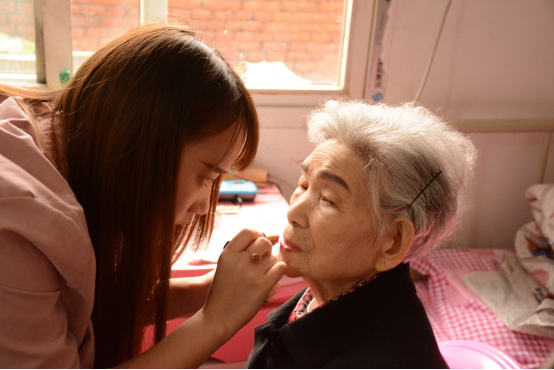 在拍摄照片时,场景甚是热闹。每个老人依次坐在座椅上,志愿者们一边为他们上妆一边与他们交流。老人们的笑声与攀谈声充满了敬老院每一个角落。老人们对志愿者不惧风雨继续前行以及细心工作表示了高度的赞扬,工作人员也对我们的工作成果给予了高度肯定。