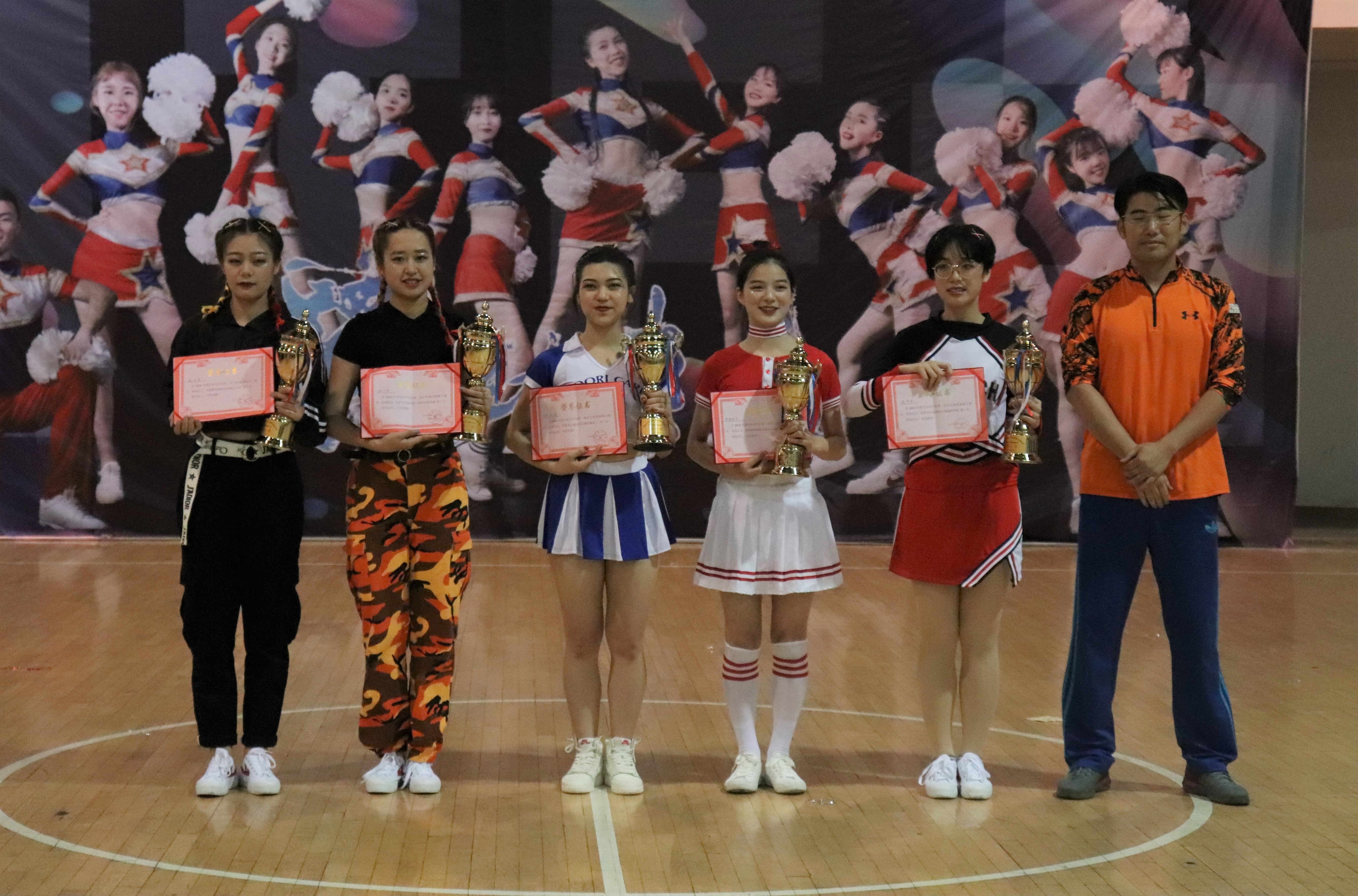 本次大赛由国家级裁判王晶晶任裁判长,一级裁判秦湘玲任仲裁,陆小凤、赵逸青、杨羽西、龙玲等老师担任裁判员。当天晚上7点,主持人宣布比赛正式开始。首轮比赛中,水彩画系作为第一支比赛队伍首先上场,音乐响起,场上的氛围瞬间被点燃。设计系位于第五个出场,赛场上,我系啦啦操队员伴随着轻快的旋律,在体育场上轻盈地旋转跳跃,绽放出明丽的笑容。场外老师和同学热情高涨,为设计系加油喝彩的声音此起彼伏。在我系啦啦操队员的努力下,设计系以421.5分的好成绩斩获二级徒手的冠军,最终包揽了规定器械操第一名、二级徒手第一名、花球规定第一名、团体总分第一名共四项大奖。