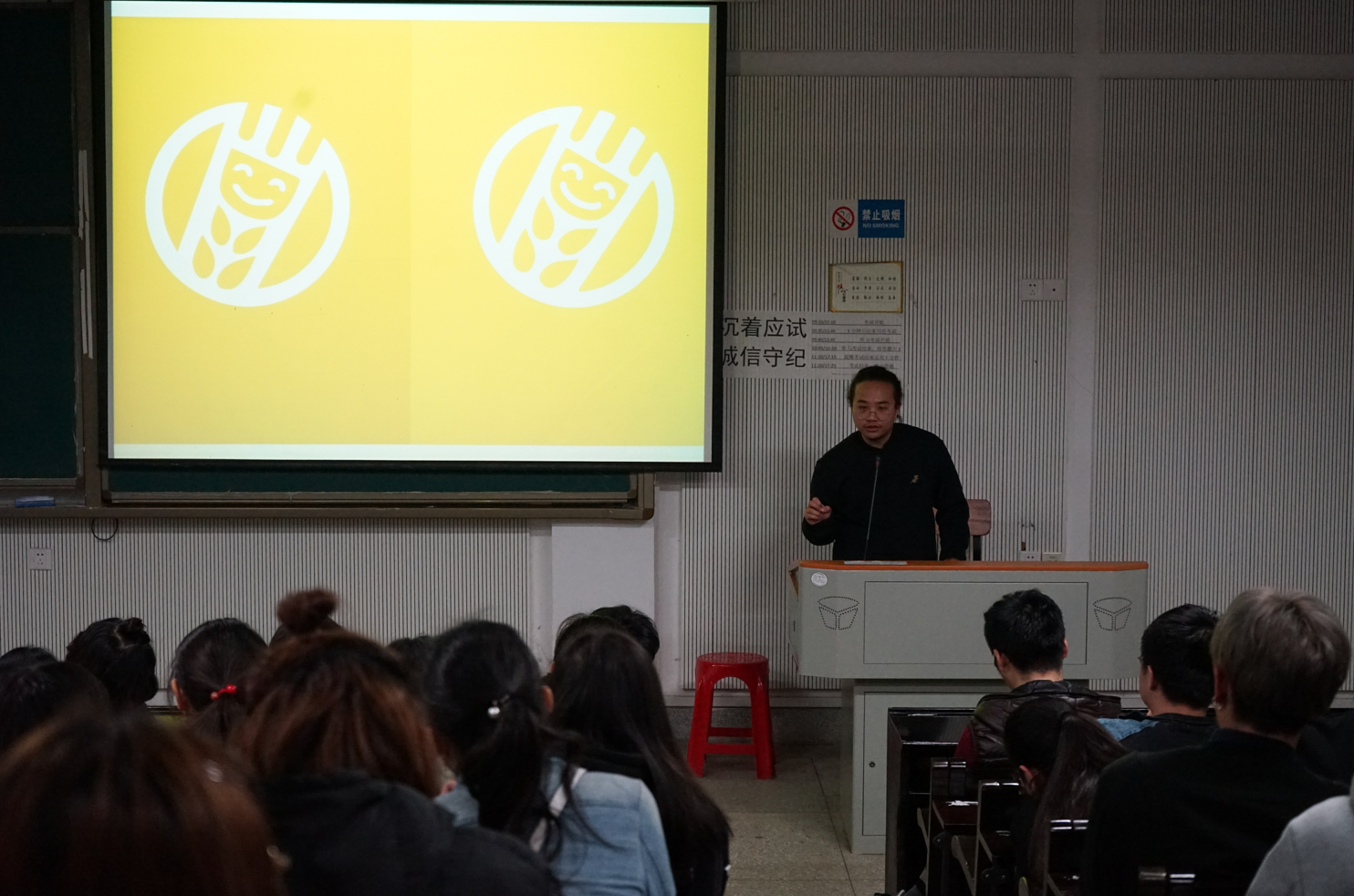 2012级毕业生艾天行首先上台并分享了自己在深圳做项目的经历,表明做设计要耐心地与客户和同伴交流,通过具体分析客户的现状与需求,设计出体贴入微的方案。接着他向同学们展示了一些效果图,并强调了学习软件的重要性:“如果连软件都不熟悉的话,有的时候尽管有好的想法,也很难实现。”最后,艾天行向同学们提出了一个问题:“你所希望的设计是什么样子的?”并在听取了同学们的回答之后,送出了精心准备的礼物。