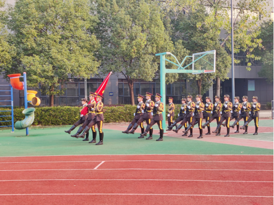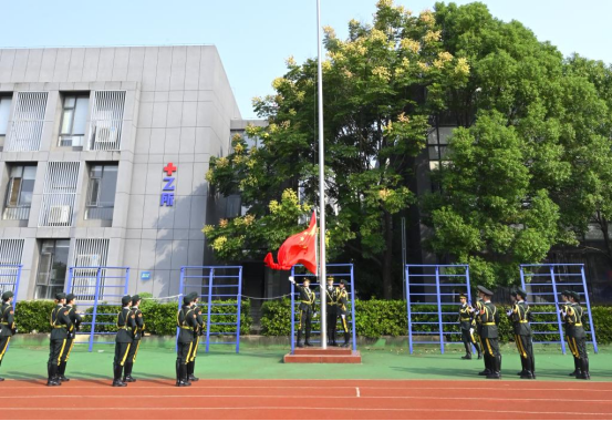 上午7:30分,英姿飒爽的国旗护卫队队员们迎着朝阳,踏着矫健的步伐,以饱满的热情,庄严地护卫五星红旗进场。雄浑激昂的《义勇军进行曲》在校园操场内响起,升旗手振臂一挥,鲜艳的五星红旗迎风展开,全体师生一起高唱国歌,并向国旗行注目礼。