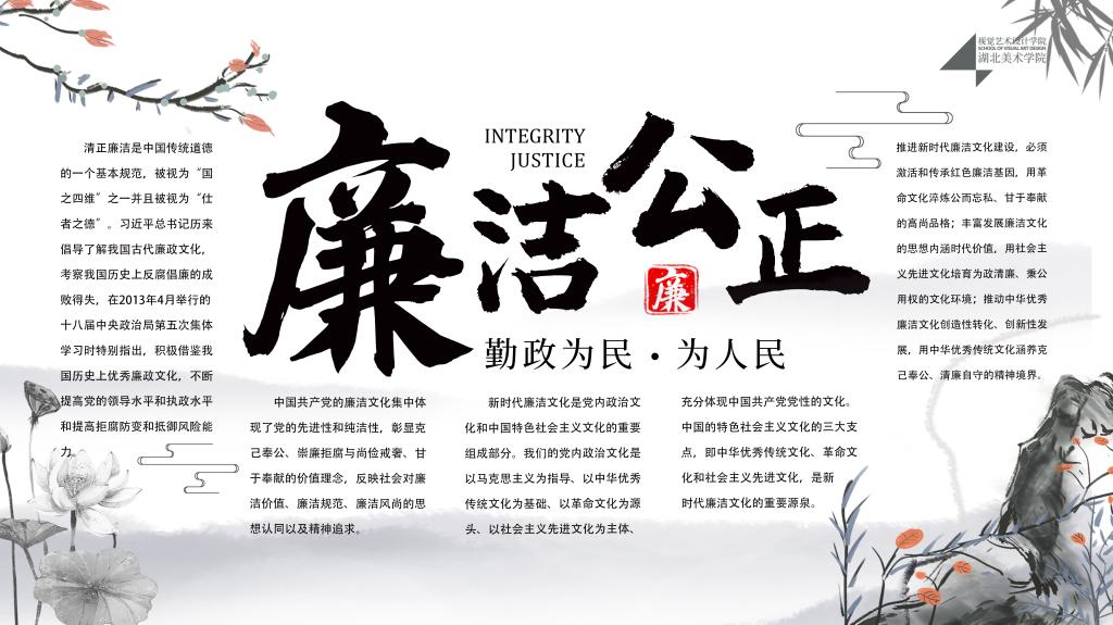 为进一步加强清廉主题教育,视觉艺术设计学院各年级还开展了“党风廉政教育”系列主题班会。通过廉洁文化主题班会,加强学生对清正廉洁的了解;以“新时代的伟大成就”的主题班会近一步让学生体会到党风廉政建设的重要性;湖美学子的廉洁文创产品展示更是贯彻廉政育人,勤政为民的理念,真正做到“传清风,正学风,扬校风”。