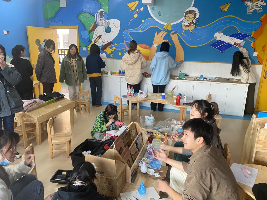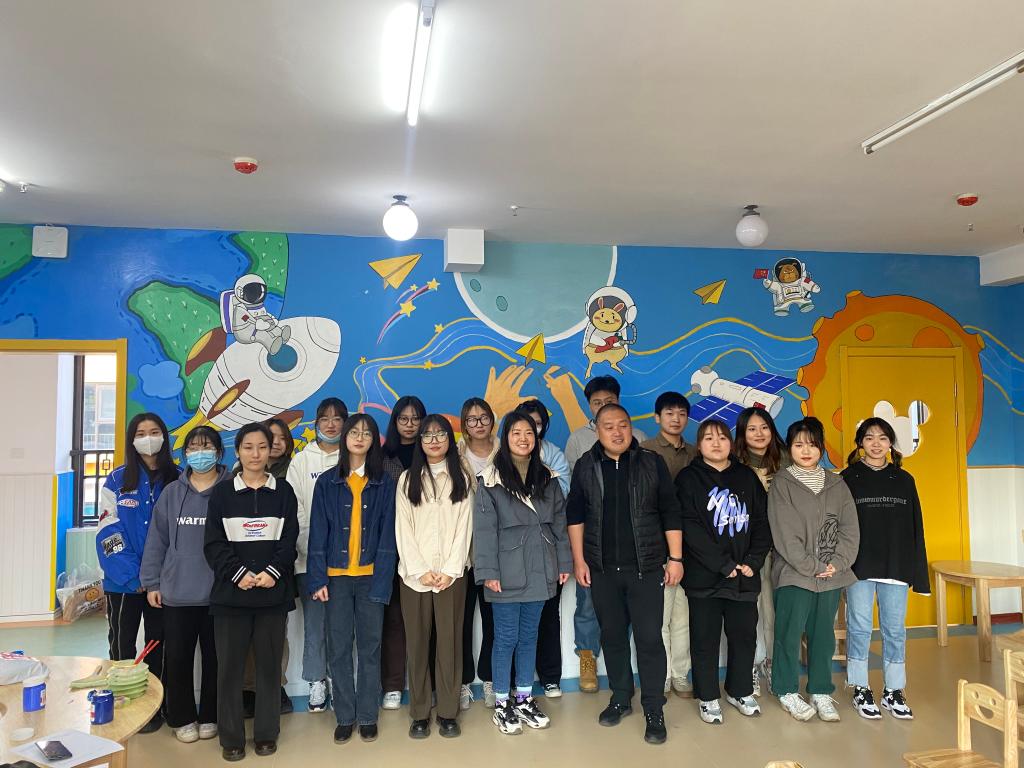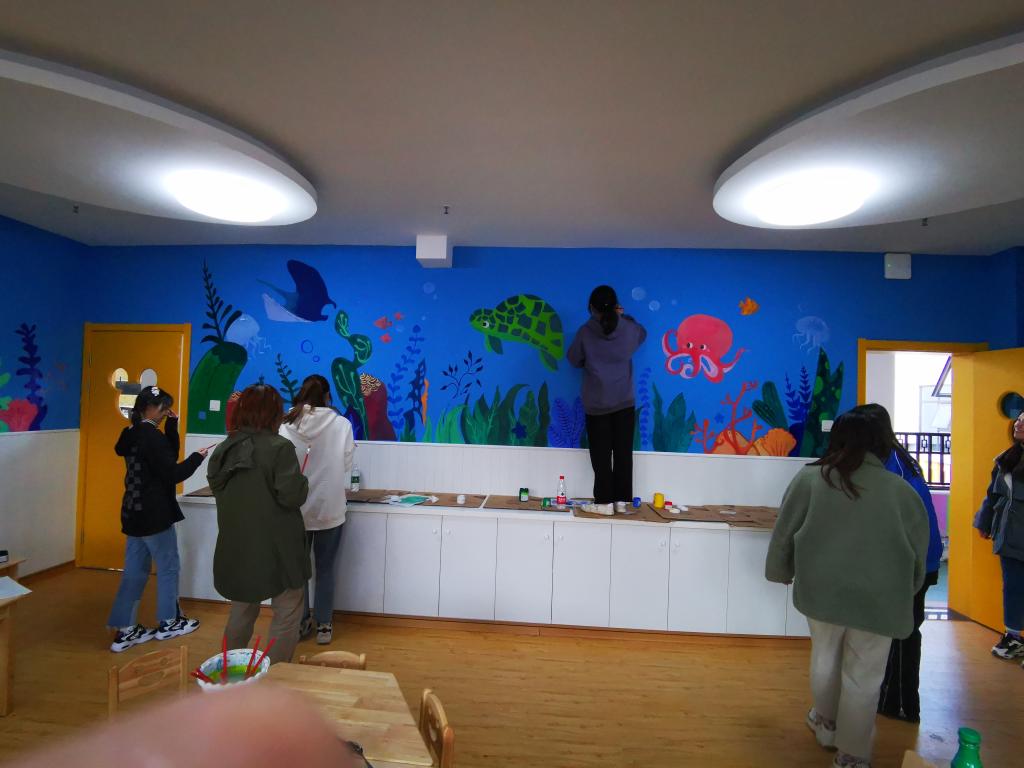 幼儿园墙绘工作湖北美术学院视觉艺术设计学院与湿地公园幼儿园合作的第一个活动,为了更好的将美术与儿童教育相结合,晨曦志愿者们充分发挥美术特长,分别以宇宙和海洋为主题,带领小朋友们探索神秘的外太空和丰富多彩的海洋世界。在让小朋友们学习环境变的更美丽的同时也丰富了小朋友们的想象力和创造力。鼓励小朋友们发现美、寻找美、创造美,拥有更出众的的审美能力,丰盈内心。