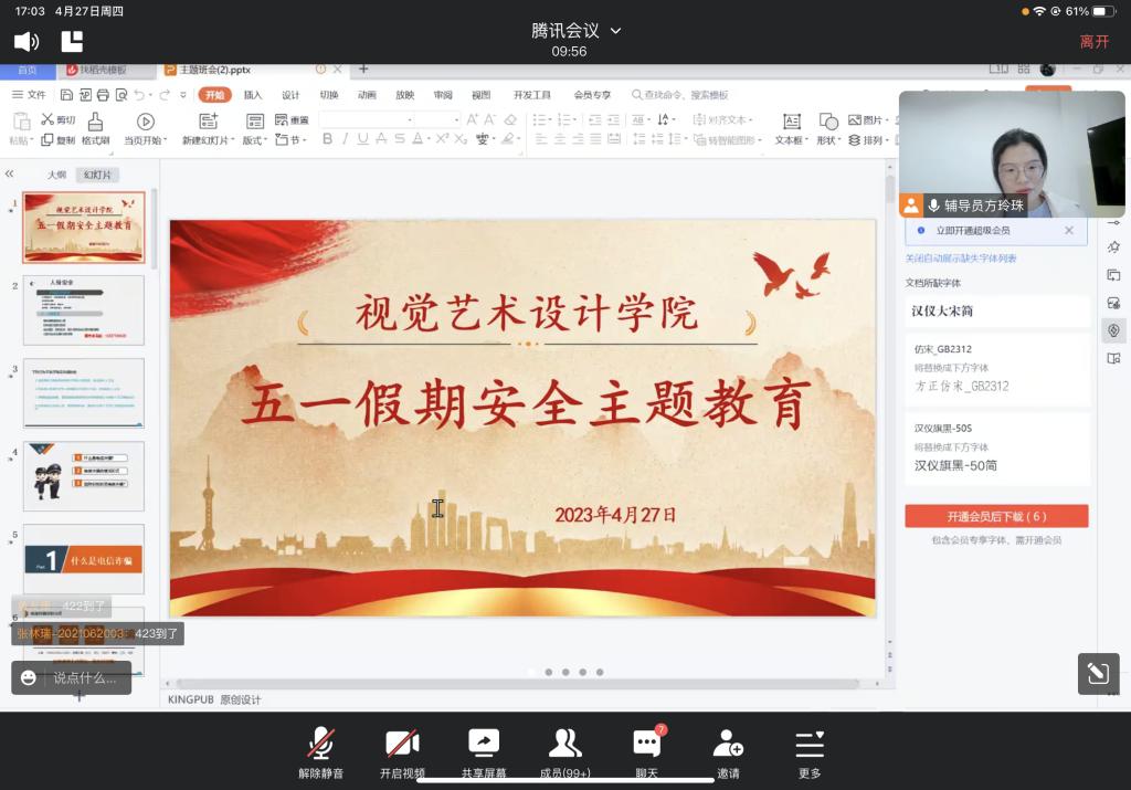 为教育引导学生牢固树立安全意识,提高防范各种安全事故的能力,切实保障自身安全,在五一假期来临之际,视觉艺术设计学院2021级本科生辅导员方玲珠老师于2023年4月27日下午17:00在腾讯会议上为学生开展一堂安全教育主题班会。会议由辅导员方玲珠老师主持,视觉艺术设计学院2021级全体学生参加。