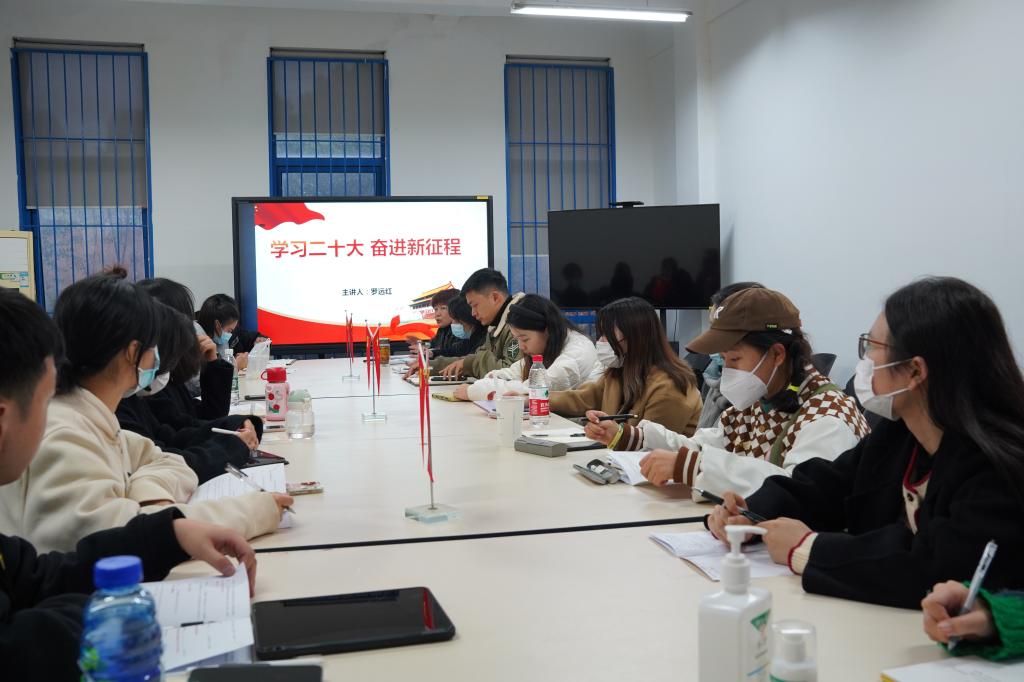 2022年11月14日下午17:30,视觉艺术设计学院分党校发展对象培训班第一课在A9-108教室开展。学院党委书记罗远红做了以《学习二十大 奋进新征程》为主题的宣讲,学院党委副书记袁秀娟、全体辅导员和15名发展对象参加培训学习。