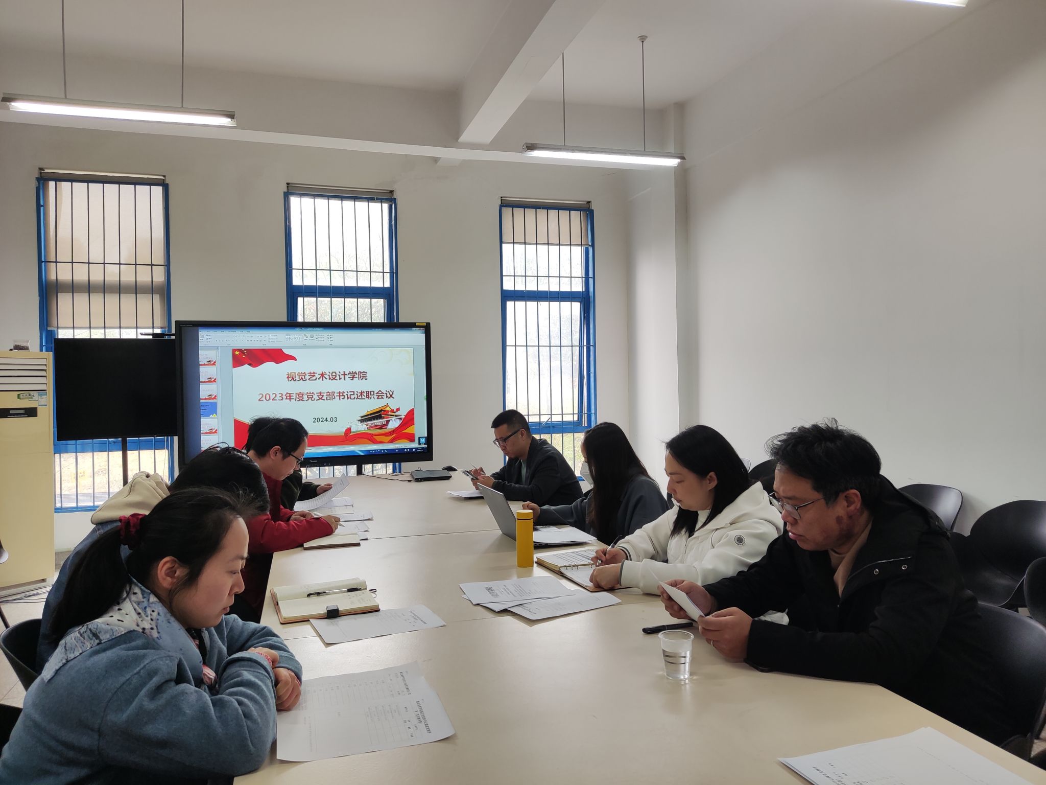 2024年3月13日中午,视觉艺术设计学院在A9-108会议室召开2023年度党支部书记述职大会。会议以党委扩大会议的形式召开,学院党委书记袁秀娟、学院各党支部书记和党员教师代表参加会议,会议由袁秀娟主持。