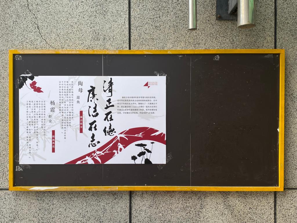视觉艺术设计学院结合专业特色,以“廉洁在德,廉洁在志”为主题制作了宣传展板,并在A9教学楼宣传栏进行展示,营造了浓厚的廉洁建设氛围,传播了清正廉洁的文化理念,促进廉洁教育走向全院师生。