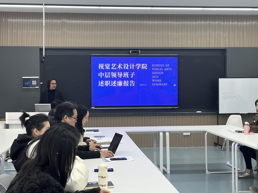 为积极推进“一融双高”,提升干部队伍凝聚力和履职尽责能力,12月13日,视觉艺术设计学院召开2024年度领导班子成员述职述廉会议,学院领导班子、各党支部书记及全体教师参加此次会议。