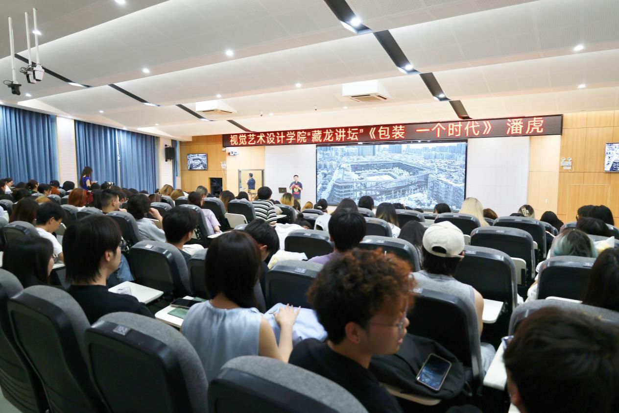 2025年5月29日晚上,中国知名产品和包装设计师潘虎特聘教授聘任仪式在A12教学楼115报告厅举行,时尚艺术学院院长吴萍教授、视觉艺术设计学院党委书记袁秀娟、学校人事处副处长王斅囡、数字信息设计系主任刘可、视觉传播系主任陈辉及师生代表共计300余人参加聘任仪式。仪式由视觉艺术设计学院副院长凃志初主持。