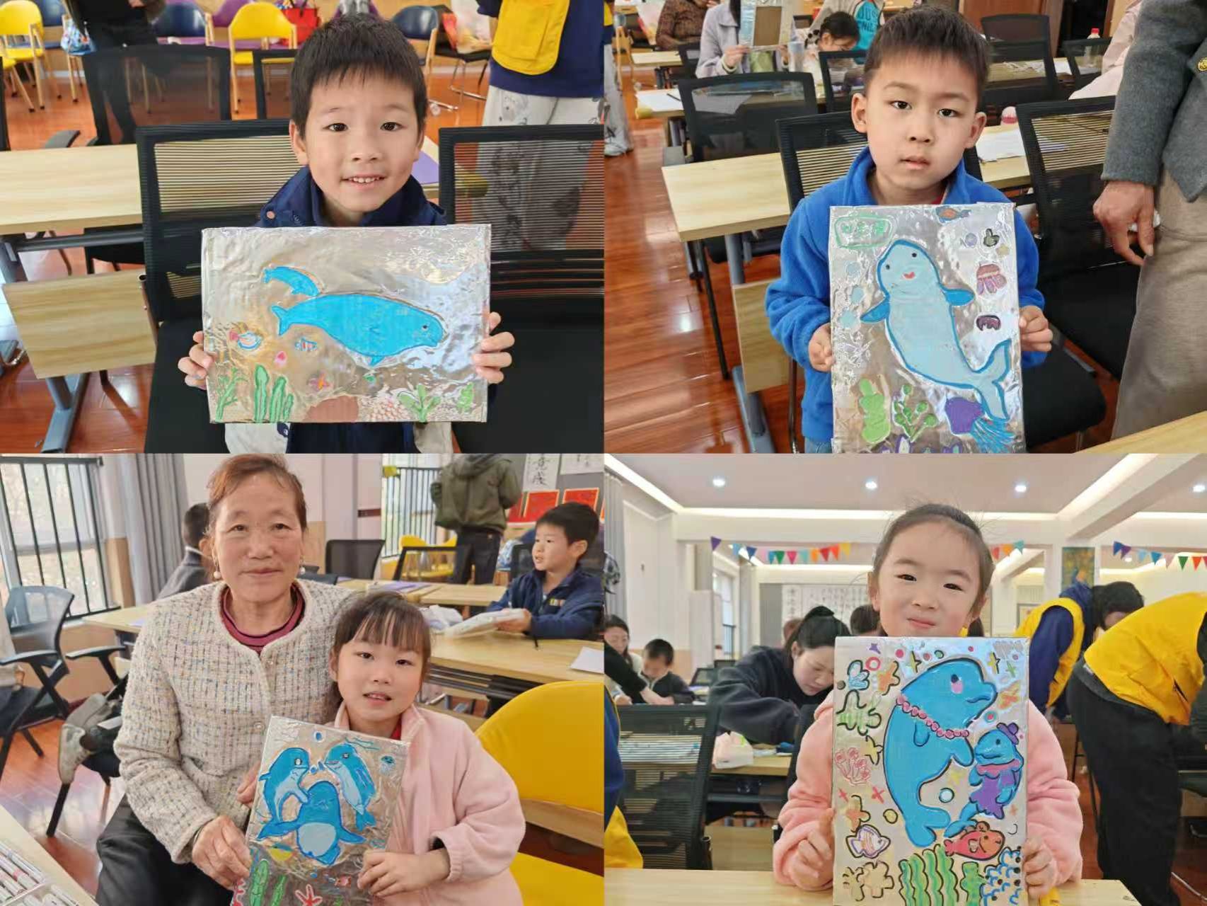 活动采用“课堂讲授+实践操作”模式,科普环节中,趣味长江生物视频点燃现场氛围,志愿者用通俗语言讲解江豚、中华鲟等特有水生生物的习性与现状,快问快答环节让孩子们在互动中深化认知,种下守护种子。创意绘画环节,孩子们以江豚为核心元素,经描边、锡纸转印、丙烯马克笔上色等步骤,将笔下的长江水下世界打造成立体作品。志愿者全程陪伴指导,让生态保护理念融入创作过程。