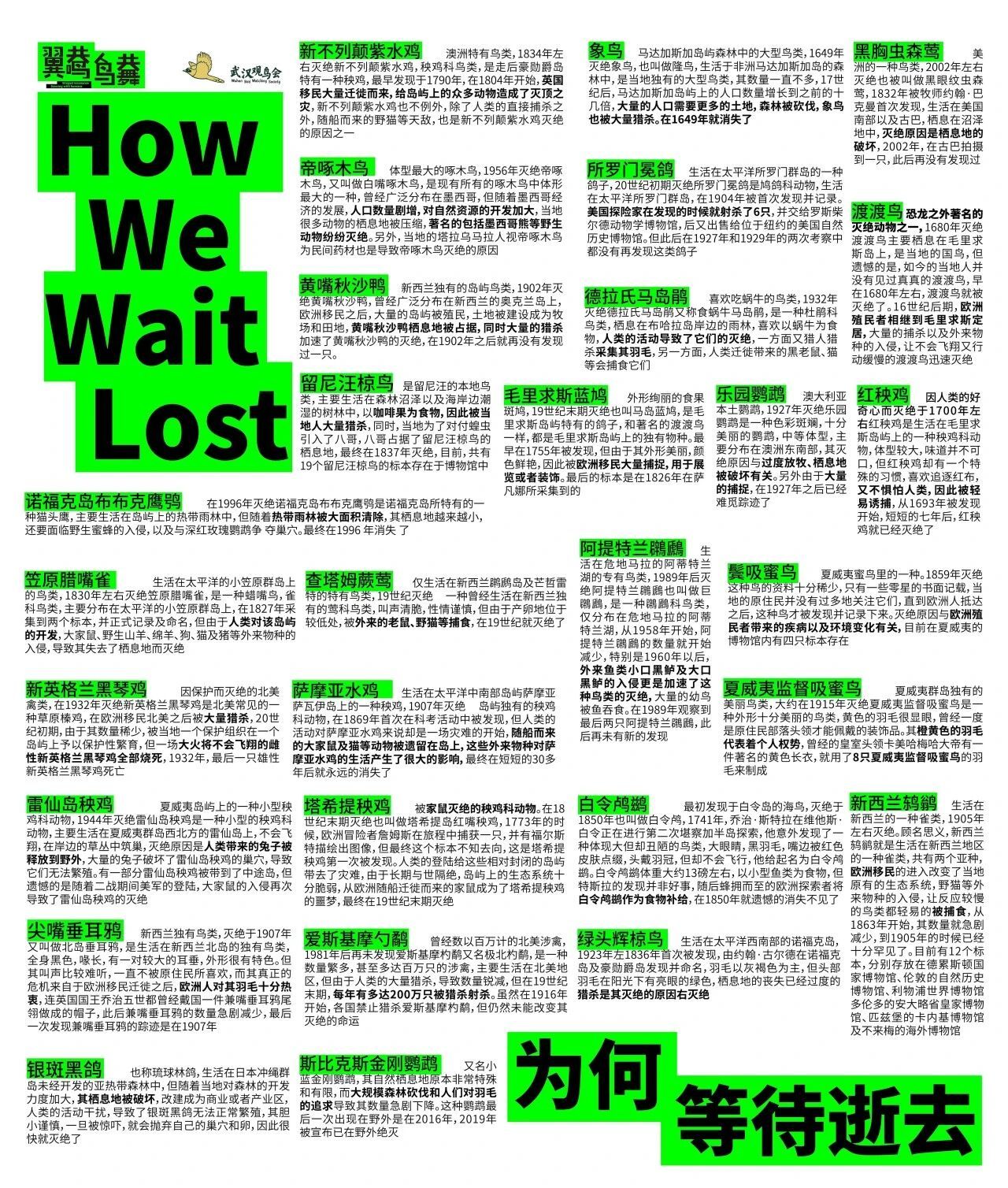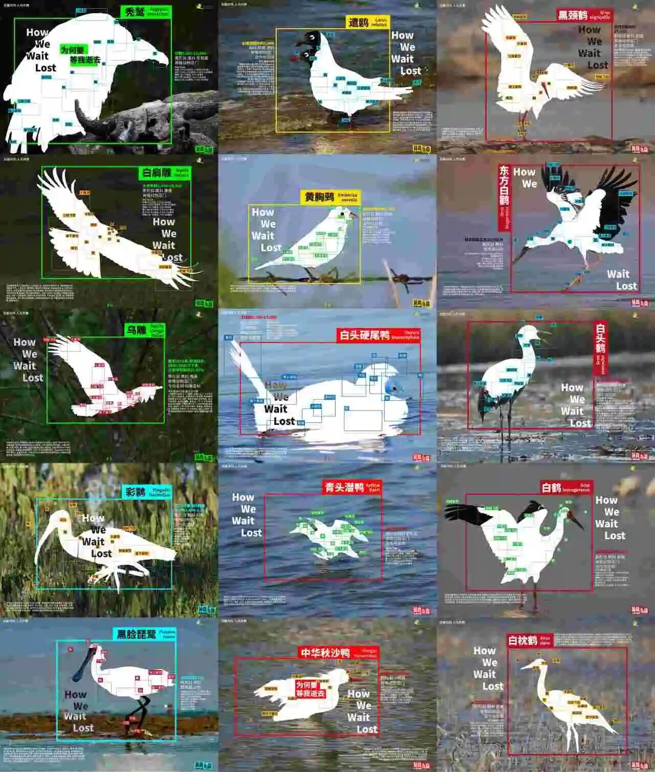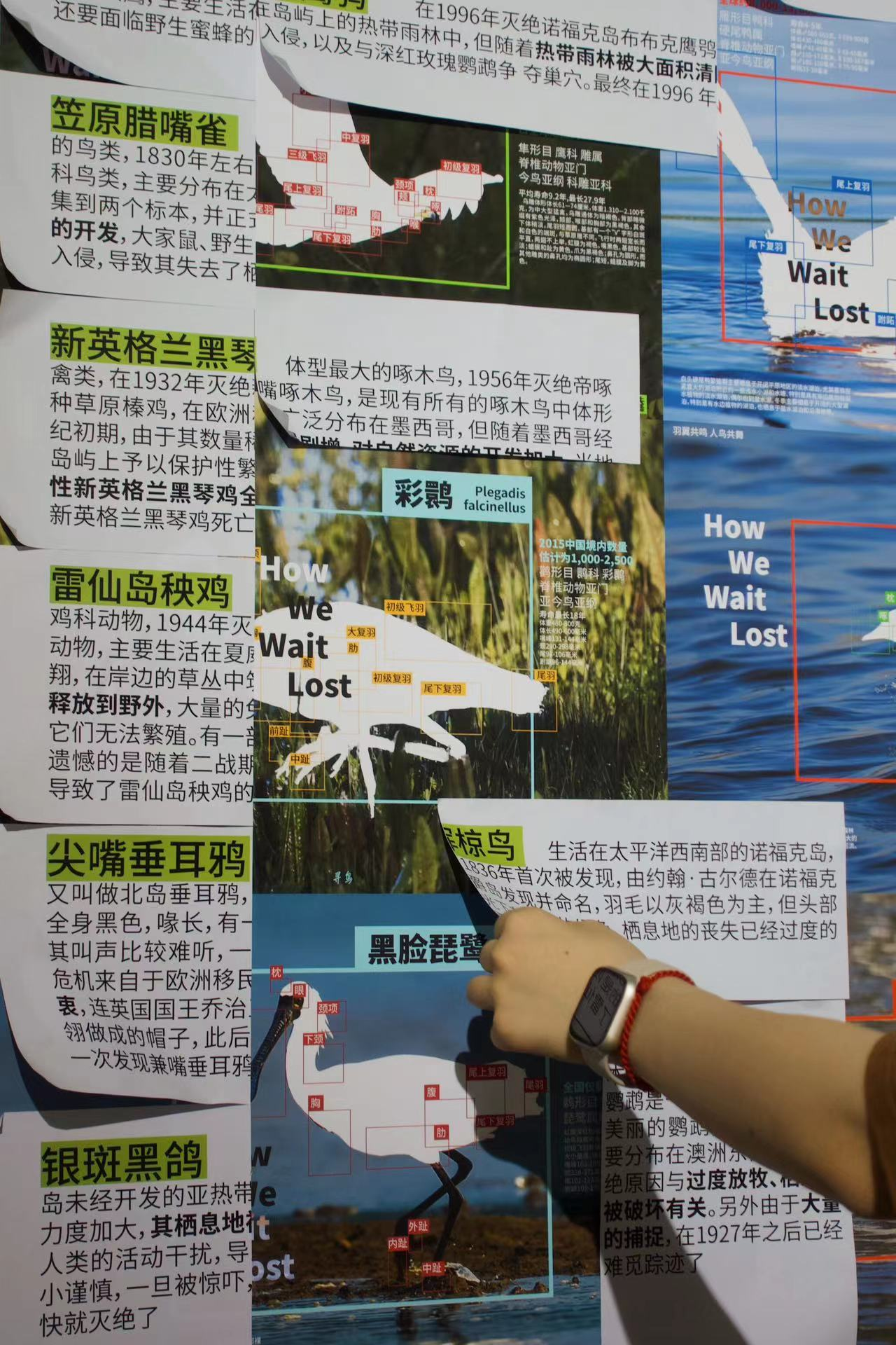 聚焦武汉湿地一级鸟类保护动物的生物多样性,以捕捉十五种鸟类的独特外形,旨在通过视觉设计作品,科学严谨地传递湿地鸟类保护的科普知识,提升公众对生物多样性和环境保护的深刻认识。设计融入“逐渐消失”的理念,利用鸟类剪影的视觉效果,引发人们对湿地保护紧迫性的关注。特别设计人鸟交流交互装置,使人类身临其境。以多感官体验方式,让公众深刻感受人鸟共生的和谐与美好,通过科普唤起人类生态环境保护和人与动物和谐共处的意识。