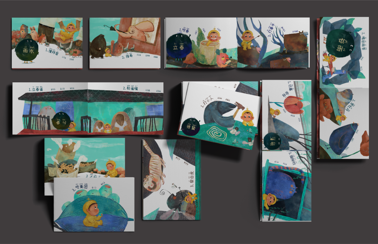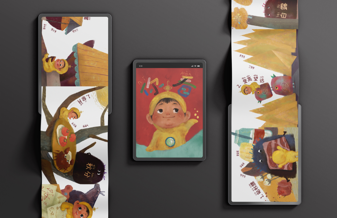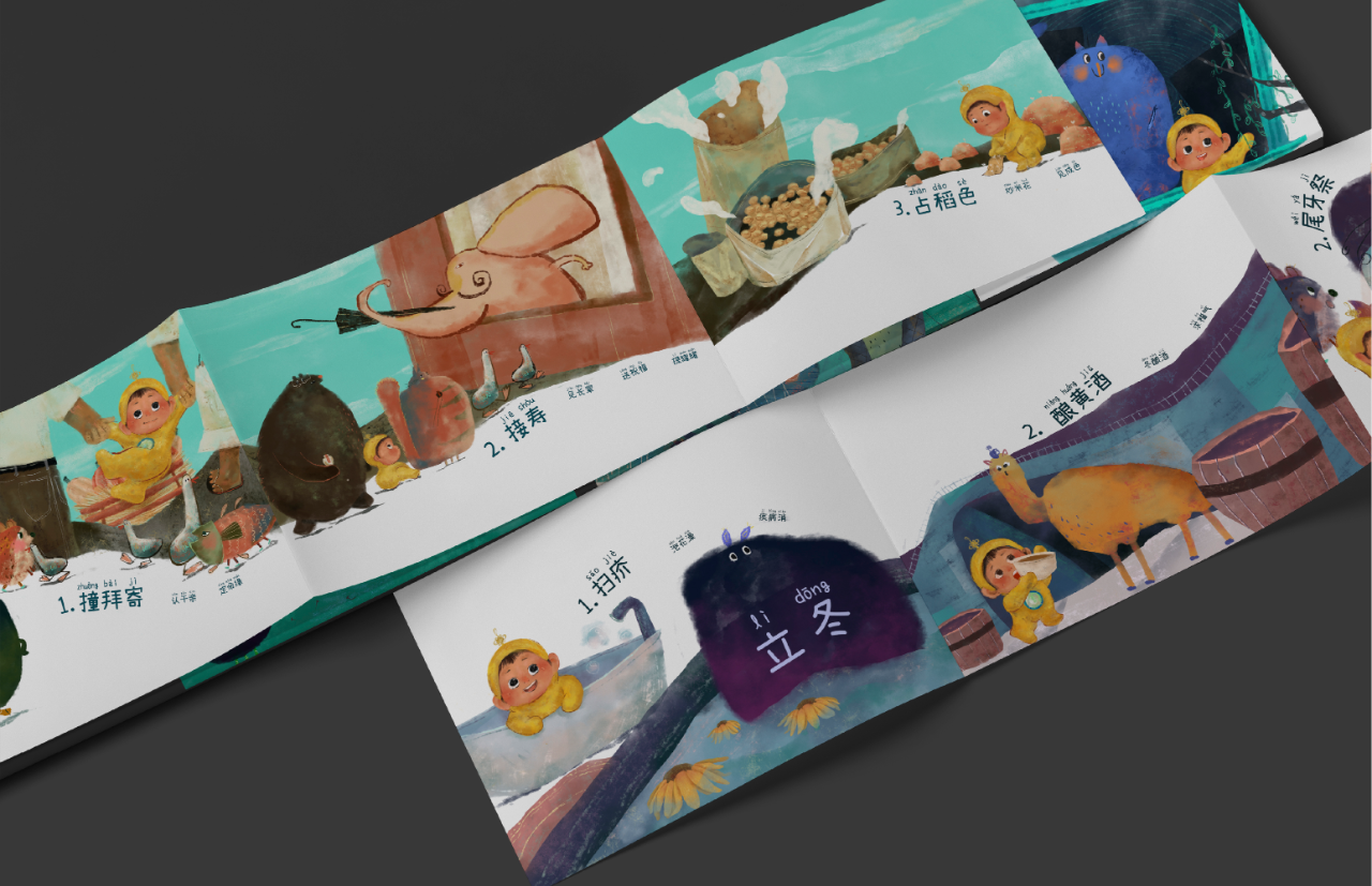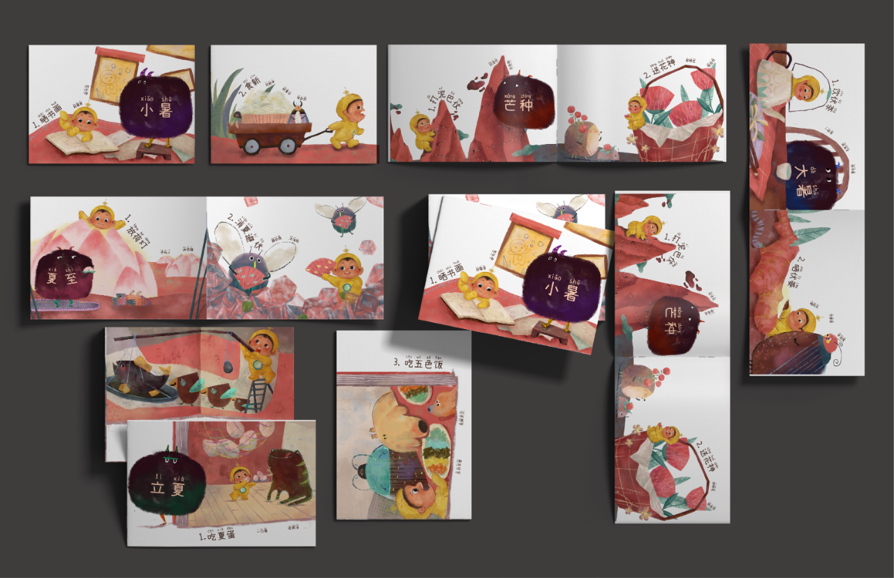 本作品以二十四节气为叙事框架,基于心流理论构建儿童友好型视觉系统,通过扁平化造型与高饱和色域降低认知负荷,采用"符号解构-媒介重构"方法论,将传统民俗转化为互动图形语言,并植入AR技术实现"静态图像-动态交互-文化认知"的层级转译。通过手势触发实现"二维到三维"的维度拓展,形成"视觉沉浸-行为互动-文化内化"的闭环学习模型,探索儿童传统文化教育在数字媒介下的认知重构路径。