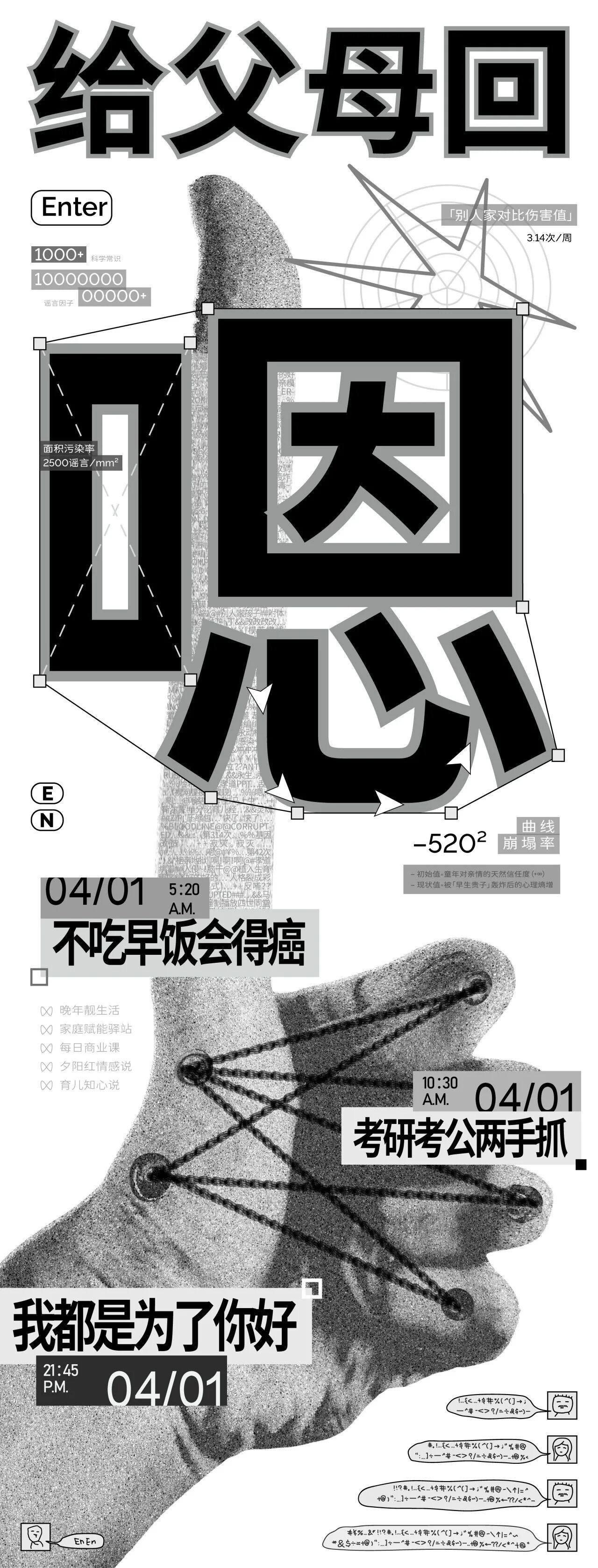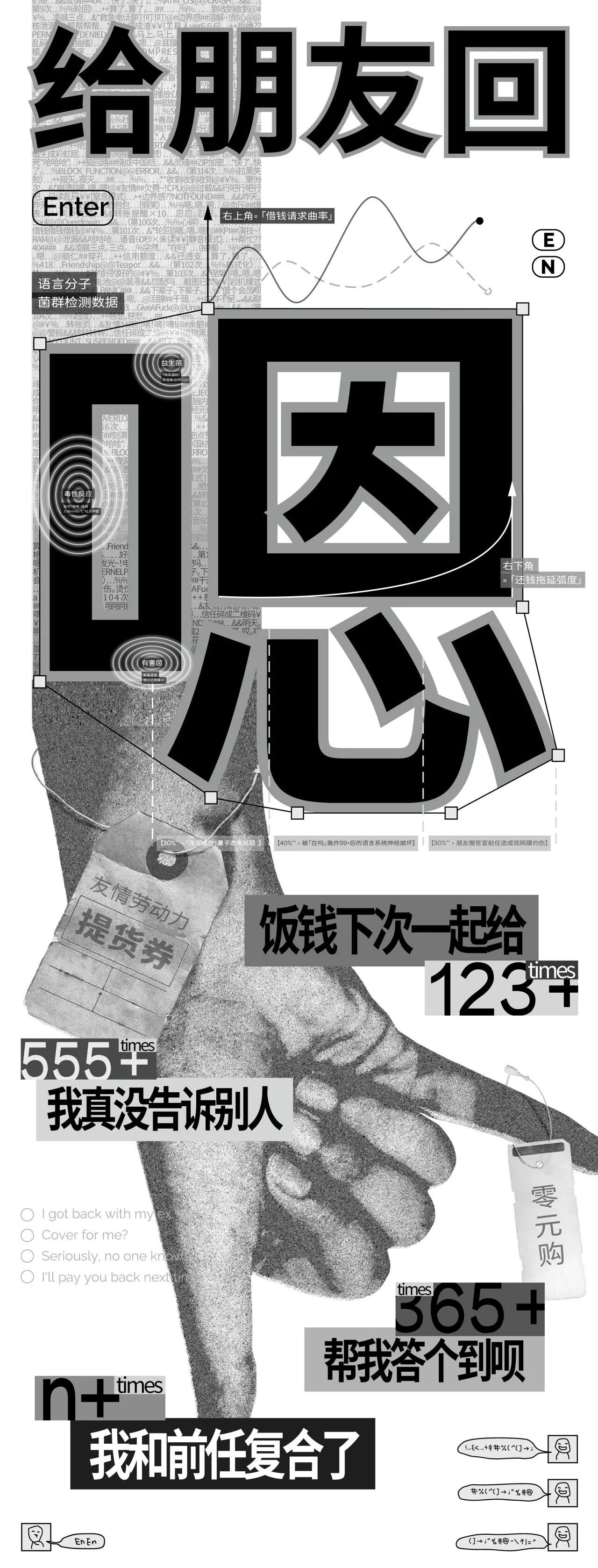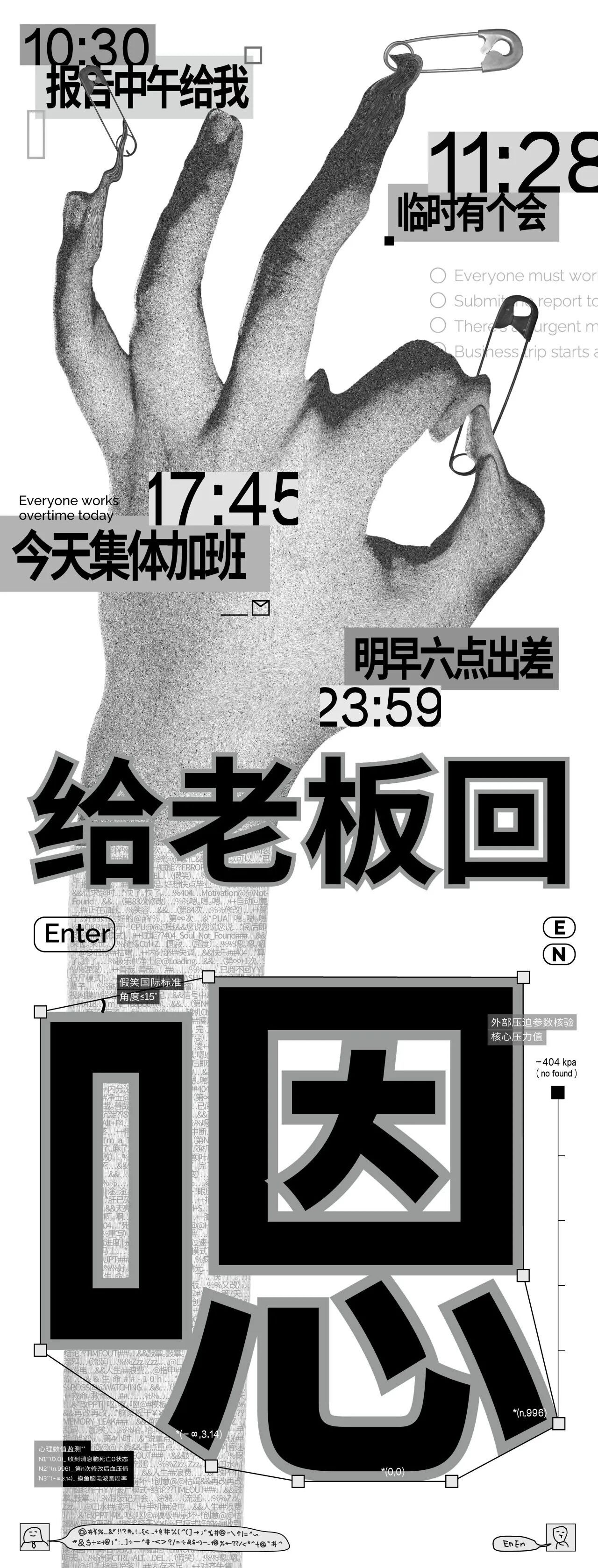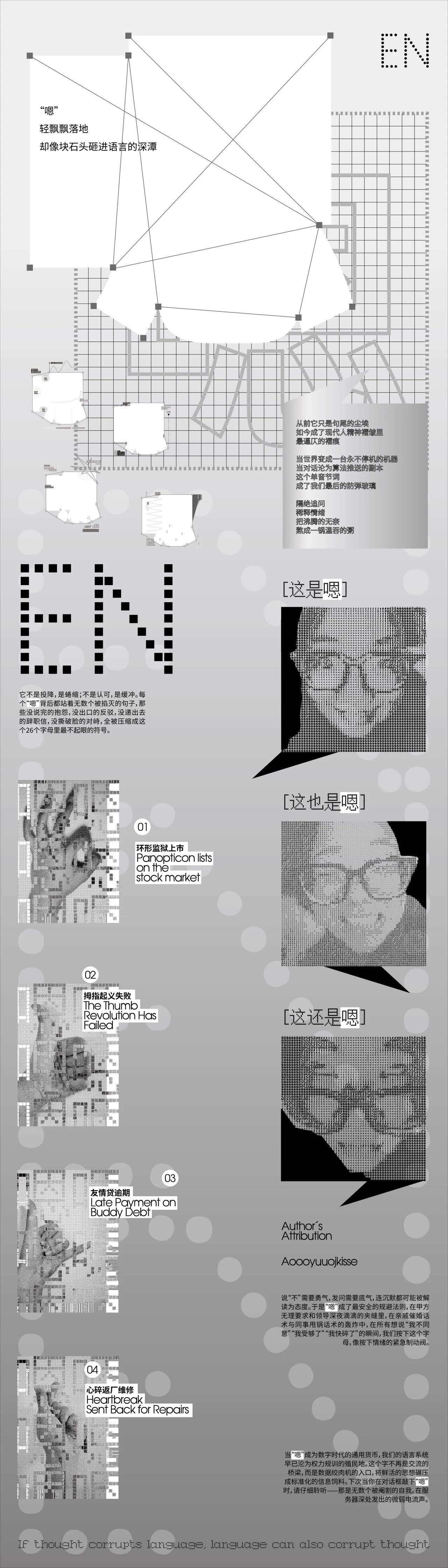 此设计以当代社交中的语言妥协为切口,将“嗯”字解构为数字时代的病理标本。通过日常手势符号剖开,暴露出内嵌的“收到”“好的”等机械应答基因,展现语言如何被权力规训。交互装置以物理压迫复现屏幕前的失语困境:键盘输入被强制规训为“嗯”,映射现实沟通中的表达阉割。设计融合暴力美学与数据化分析批判,用聊天记录等视觉隐喻,揭示“嗯”背后的精神钙化现场。这不是一场设计实验,而是一次对语言癌变的急诊记录——当妥协成为生存语法,我们终将在沉默的奇点失语。