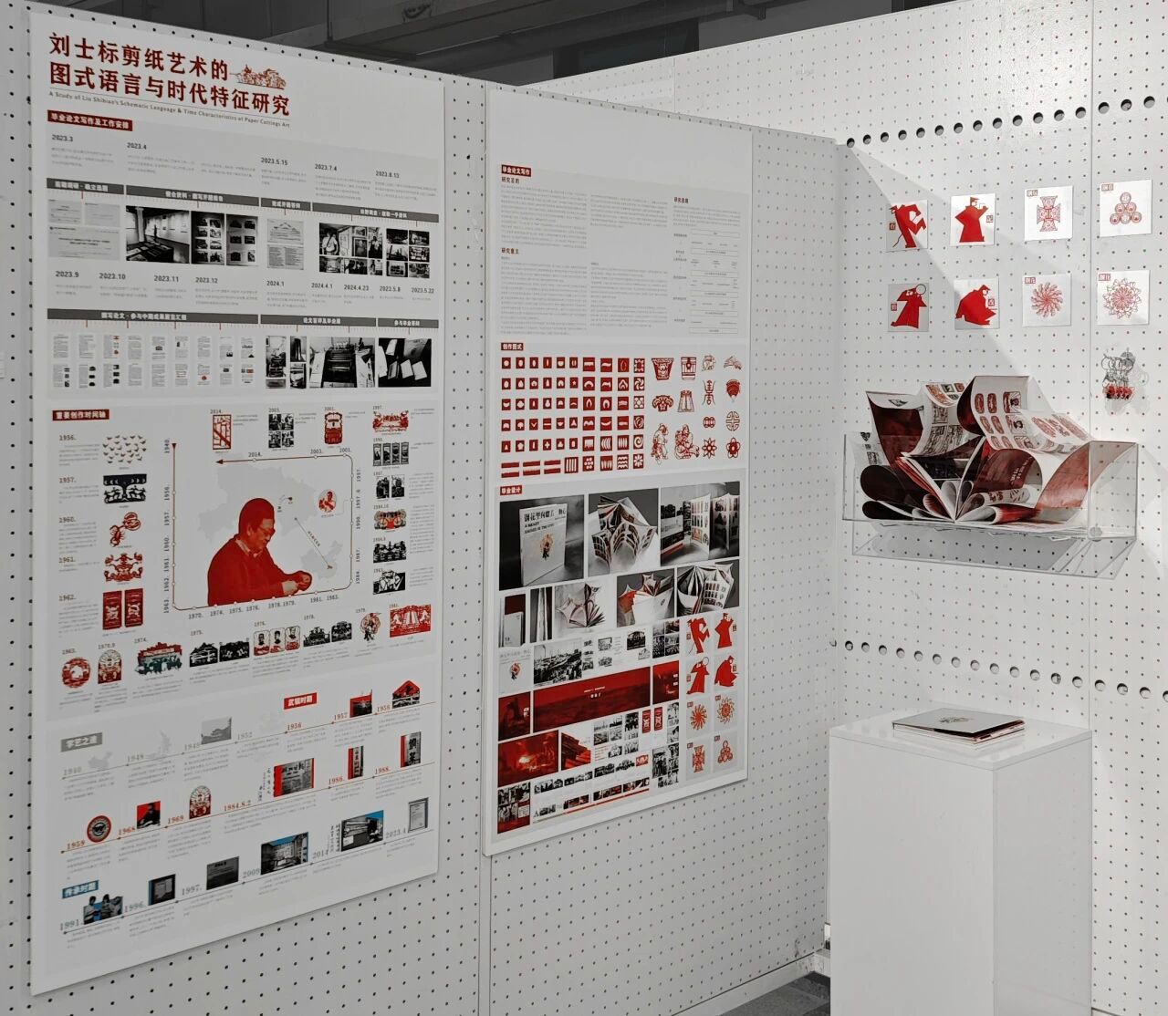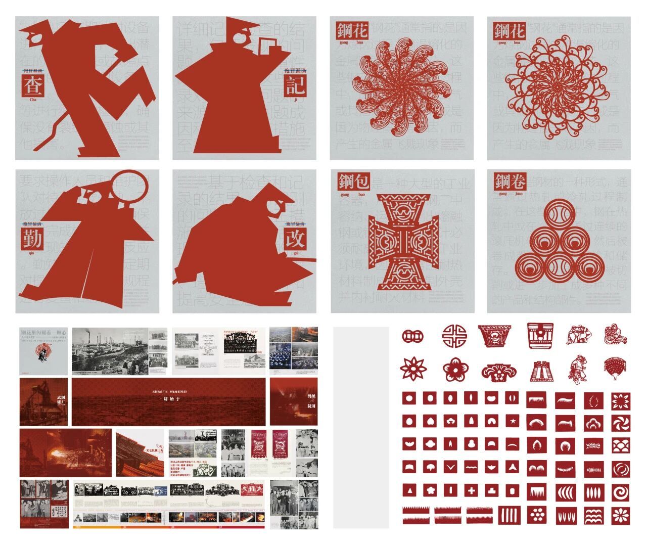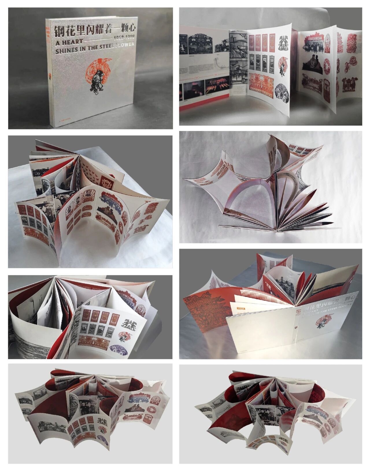 《钢花里闪耀着一颗心》的装帧设计灵感来源于研究对象——刘士标在武钢的制钢环境中创作剪纸的经历,展现了钢铁工人在炼钢过程中的不懈努力及其日常生活。整本书的开合造型模拟了钢铁厂中钢花四溅的场景,内部结构设计考虑到了内容展示与艺术互动性。通过硫酸纸承载着刘士标的剪纸作品,设计为可翻折的结构,增强了阅读的互动性和探索感,读者可以通过剪纸创作背后的故事和历史背景来理解和欣赏刘士标的剪纸艺术。
