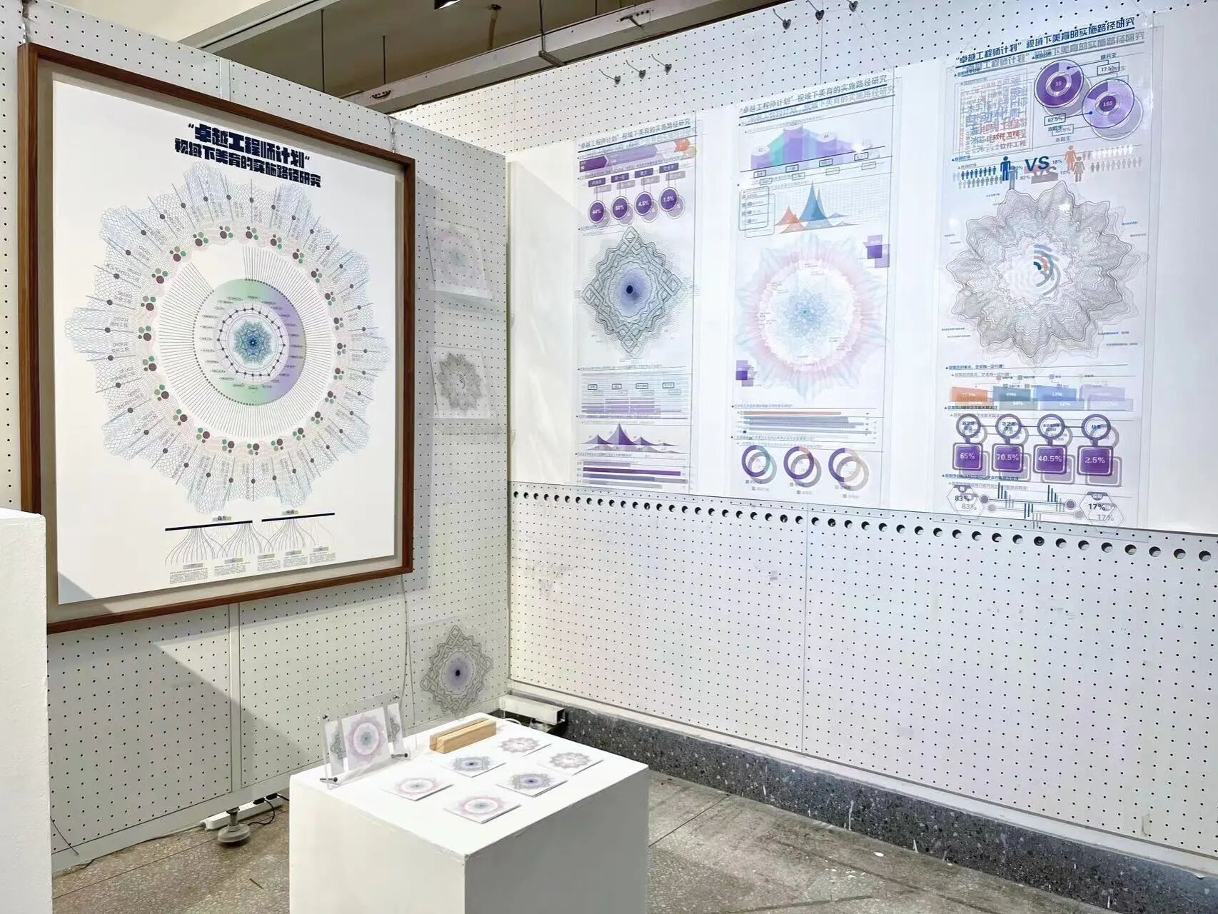 作品采用信息可视化的方式呈现,将论文的各种数据以可视化的方式呈现出来并加以螺旋对称的视觉设计,整体采用低饱和度的颜色,配合内容营造一种清爽干练的视觉效果。