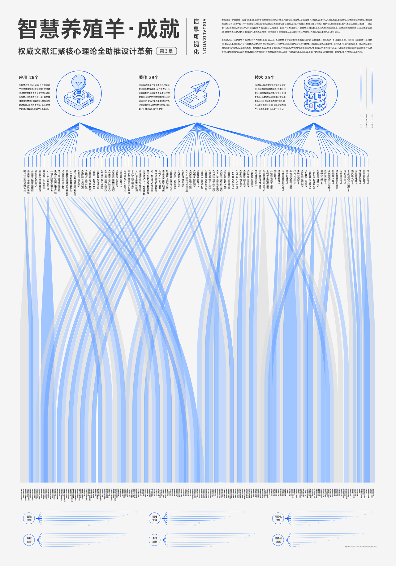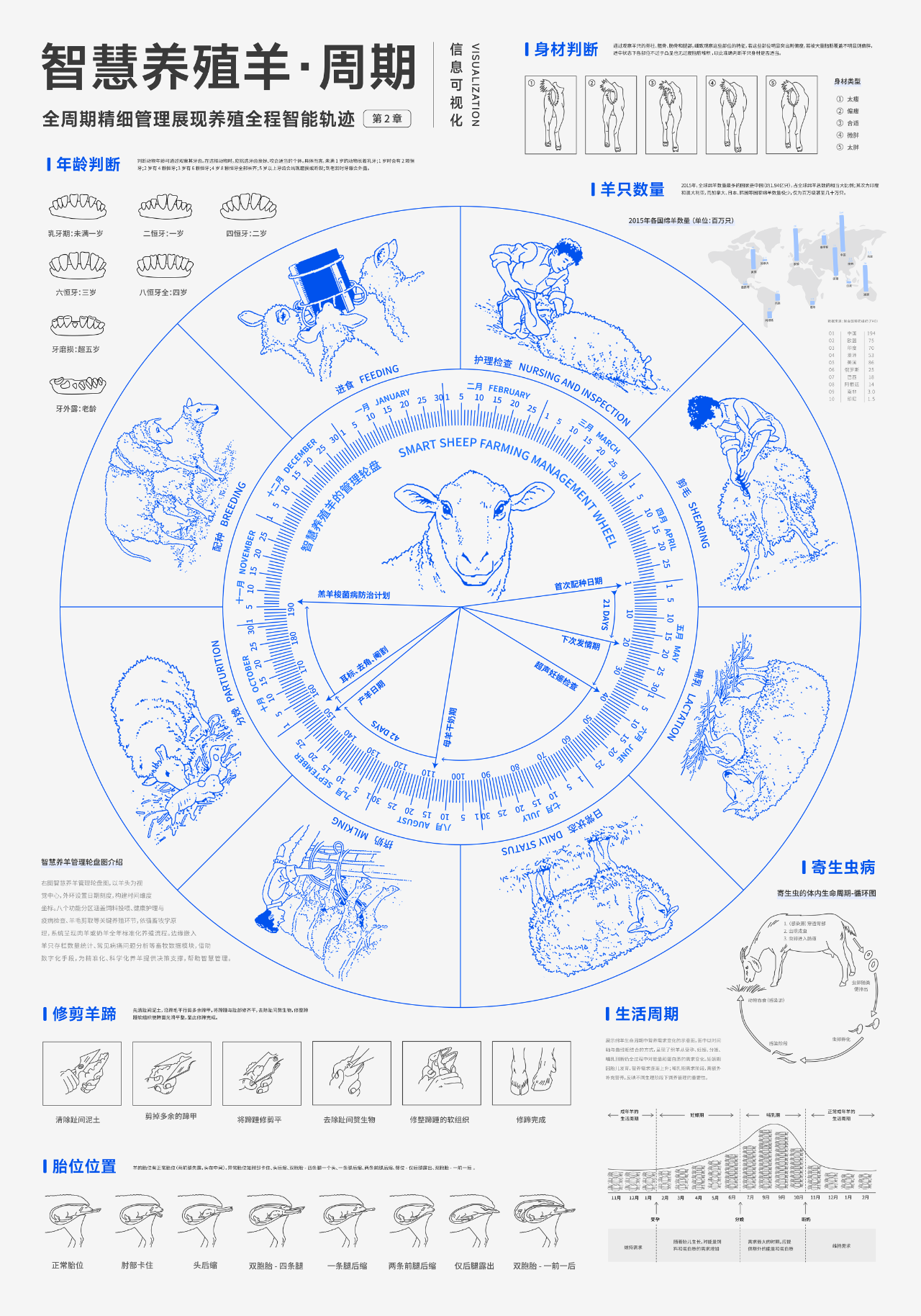 以“智慧养殖”为主题,聚焦羊只养殖中的关键环节,探讨信息可视化在农业智能化中的应用。围绕设备系统、生命周期管理与成果数据三个方面,通过插图展示智能栏舍、自动饲喂、健康监测等设施功能,采用时间轴梳理养殖周期关键阶段,并以图表呈现科研与政策成果,提升信息的可读性与传播力,助力智慧养殖理念的推广与农业数字化发展。