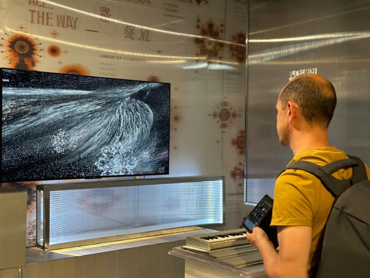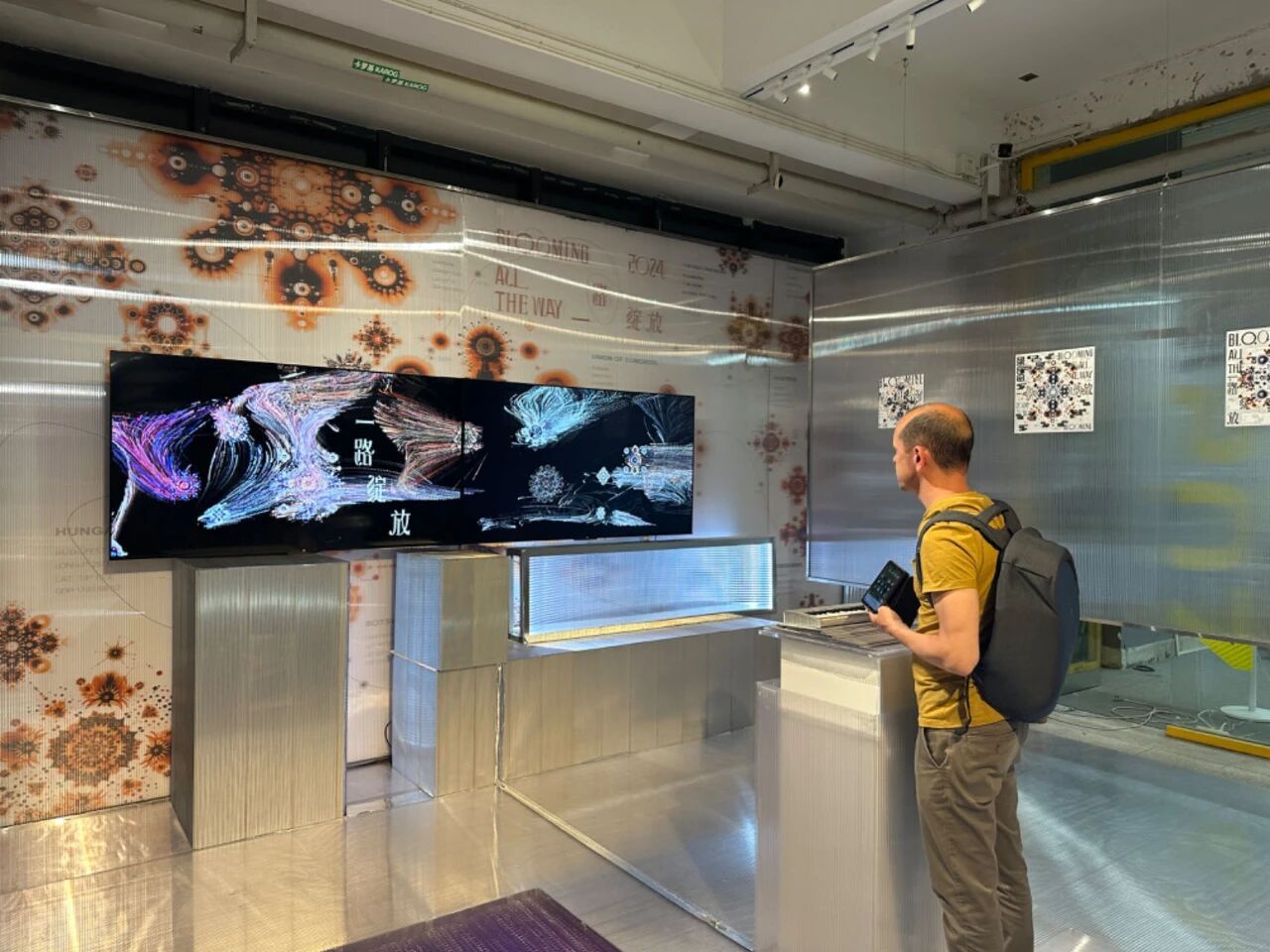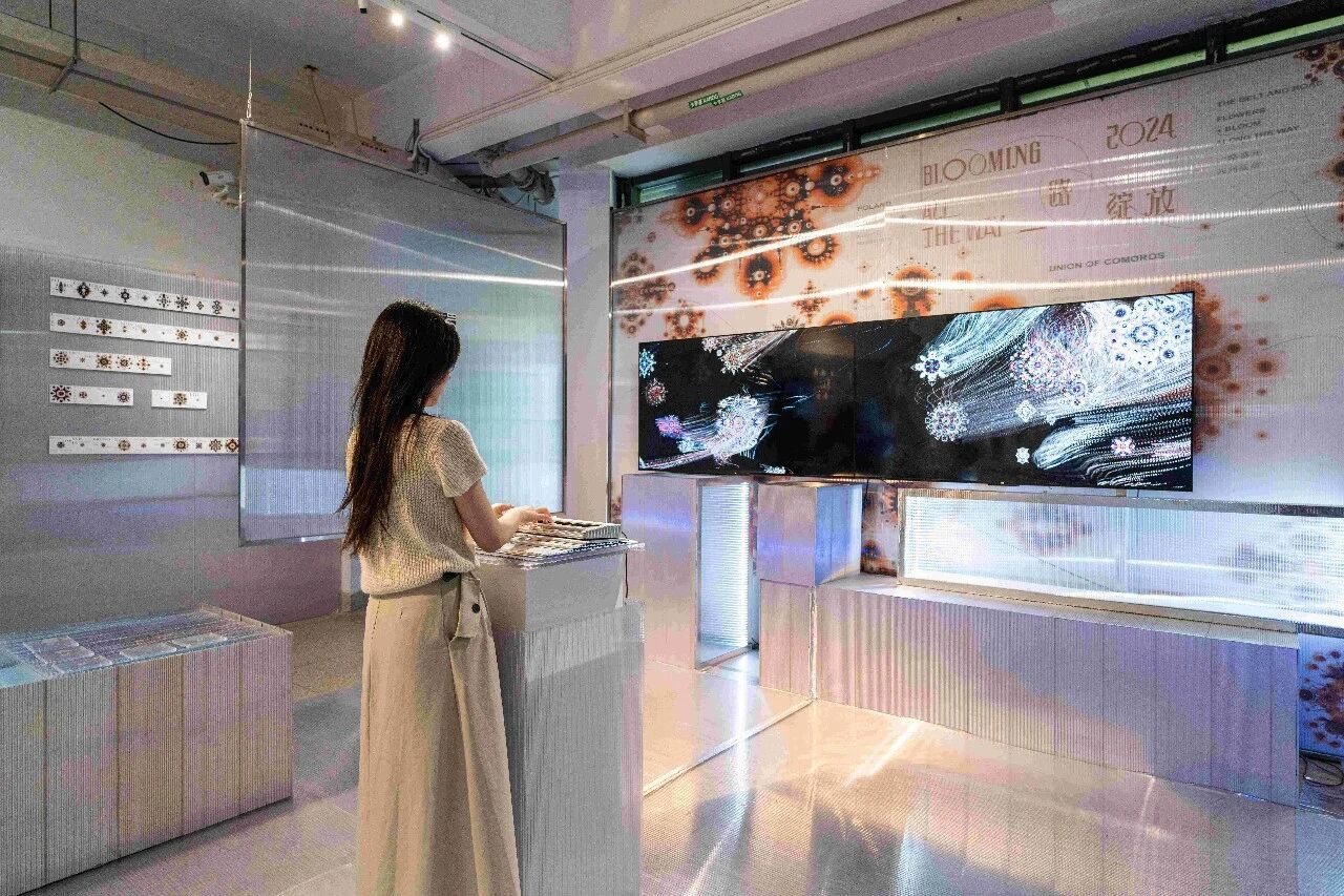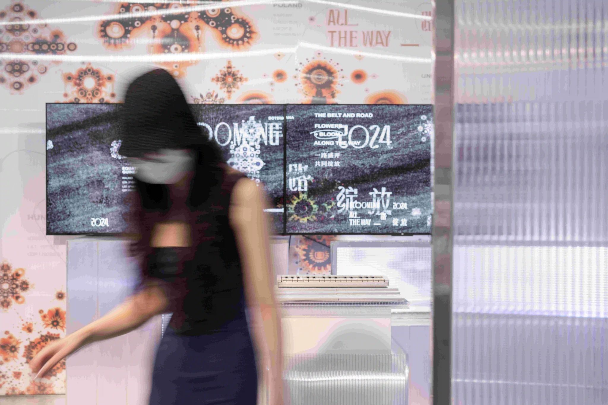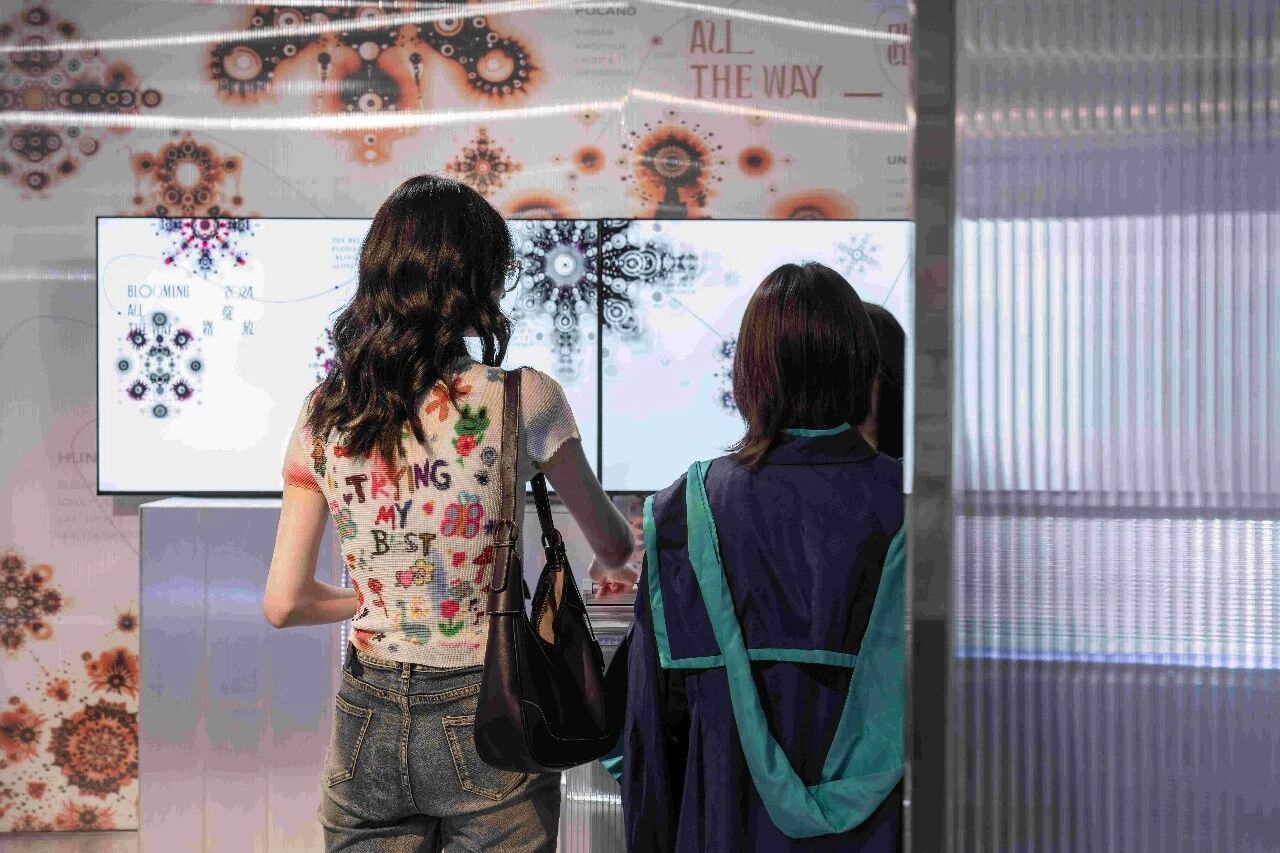 作品通过智慧图像与交互装置设计,呈现出”一带一路”沿线国家的数据可视化。”一带一路”作为重要的国际平台,发挥着至关重要的文化传播作用。各国的重要国家标志一一国花国歌作为数据支撑,结合中国传统视觉表达元素,以更国际化的形式,更大的声量传播出中国声音。