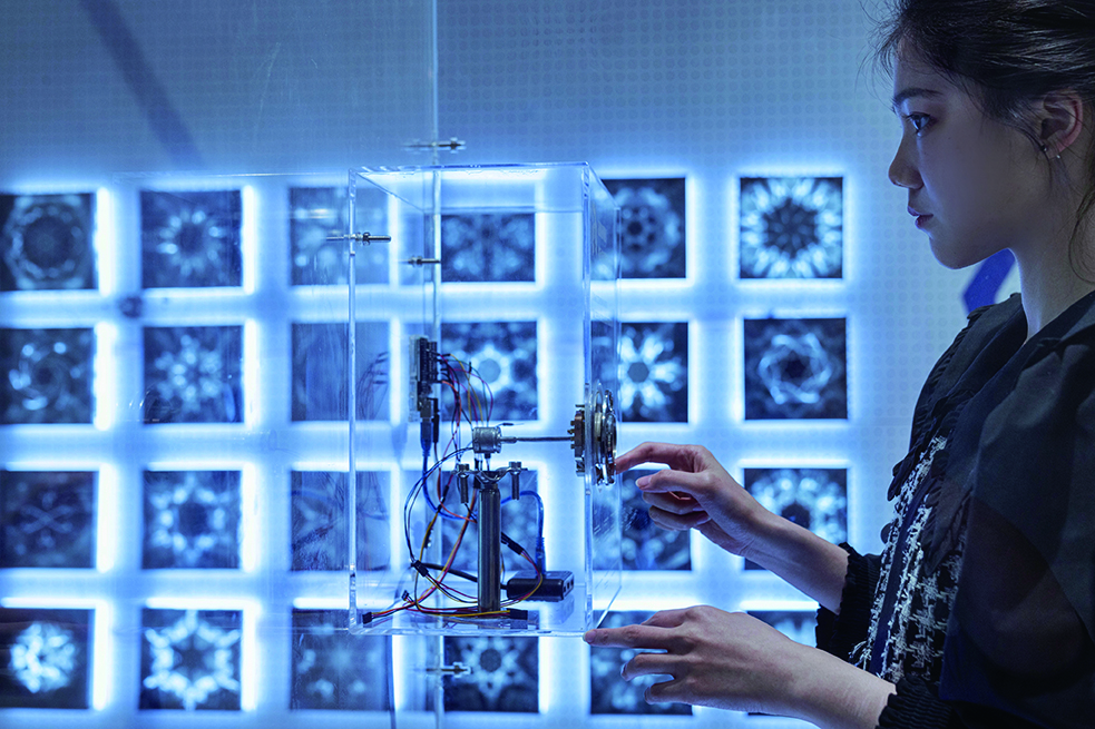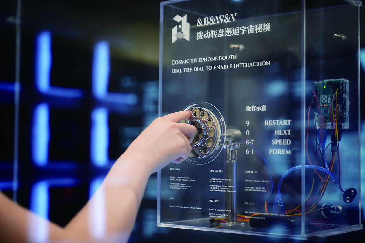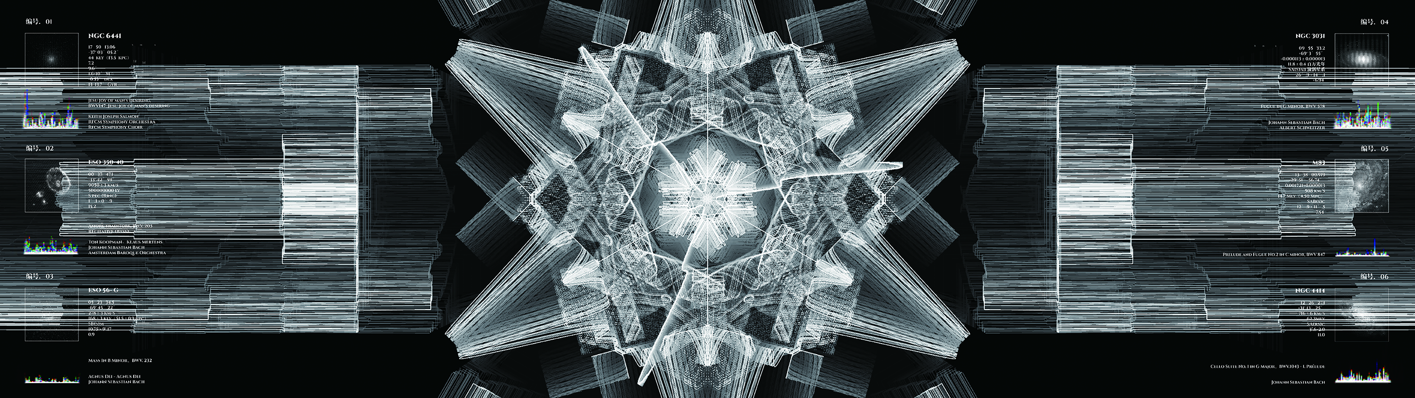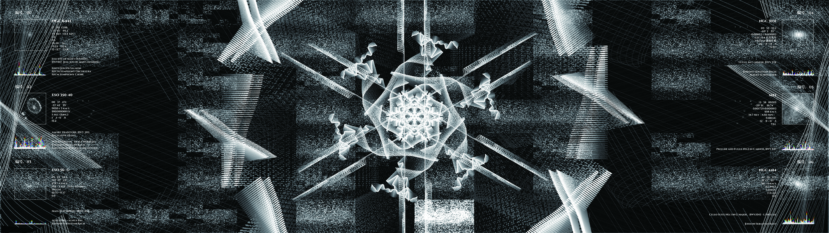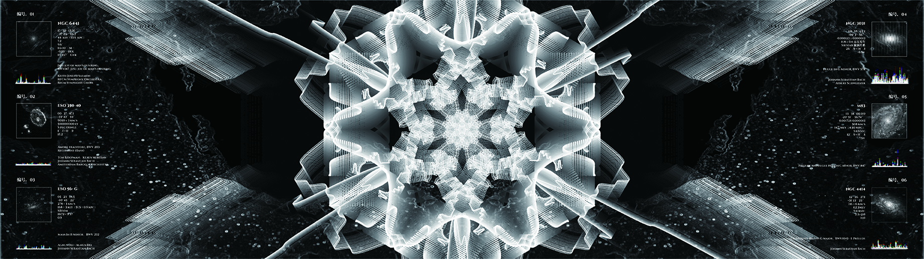 音乐之所由来者远矣,始于度量,本于太一。数字构成世界万物,生命中的基因序列,音乐中的音律音程,宇宙中的元素与常数等等,而这一切都可以坍缩成一片微观的雪花。我们将雪花用函数曲线构成,音乐作为影响雪花成形的外部变量因素与函数雪花进行视听联觉。最终我们打造了一个宇宙电话亭的交互场域,当观者拨动电话拨盘的那一瞬便开启了一场与宇宙的超时空对话。
