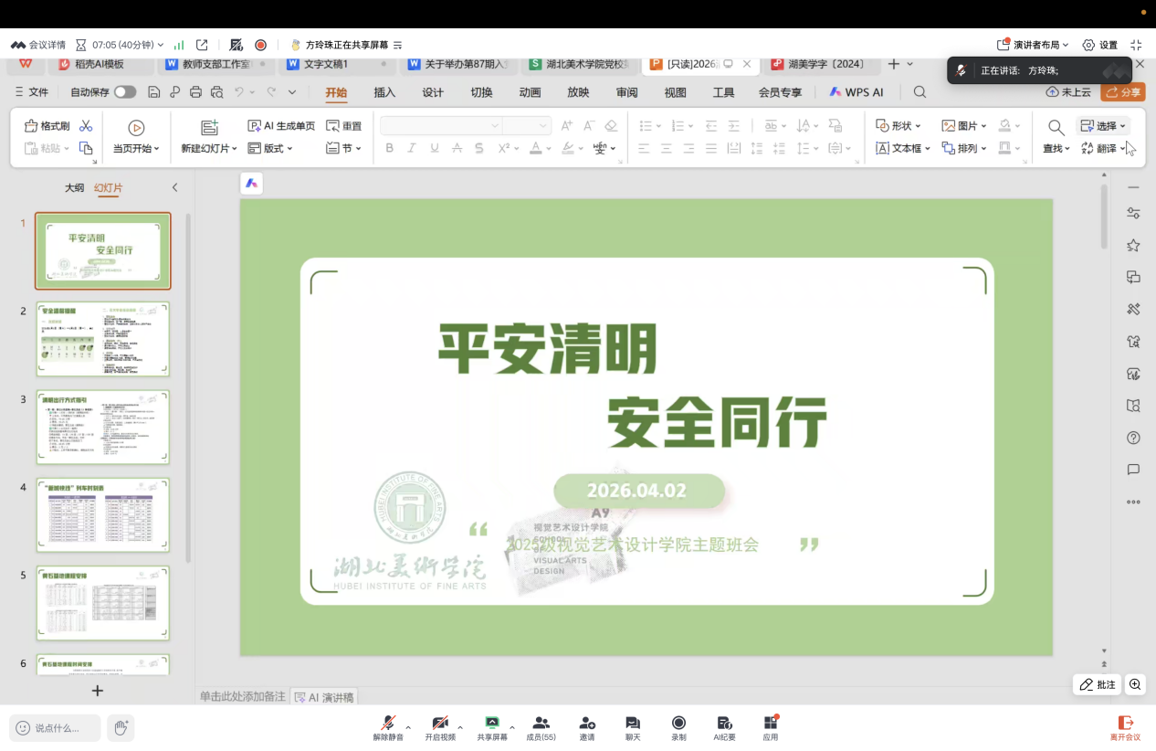 为切实做好清明假期学生安全教育管理工作,确保假期前后教学秩序平稳有序,4月2日晚,视觉艺术设计学院2025级全体学生在腾讯会议召开清明假期安全主题教育班会。本次班会由2025级辅导员方玲珠主持,全体2025级学...