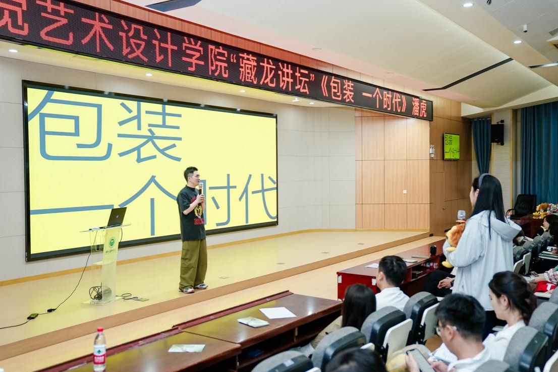 2025年5月29日晚上,中国知名产品和包装设计师潘虎特聘教授聘任仪式在A12教学楼115报告厅举行,时尚艺术学院院长吴萍教授、视觉艺术设计学院党委书记袁秀娟、学校人事处副处长王斅囡、数字信息设计系主任刘可、视...