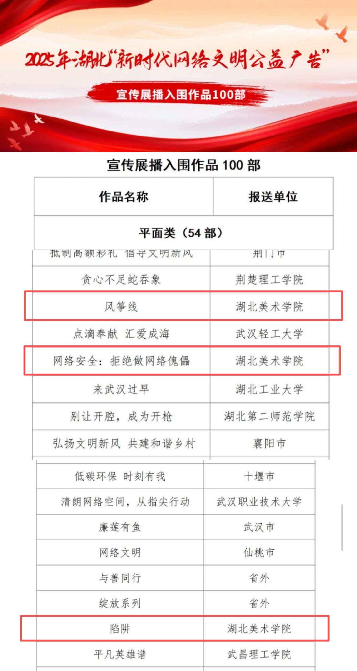 近日,2025年湖北省“新时代网络文明公益广告”优秀作品评选结果揭晓,视觉艺术设计学院多幅学生作品凭借鲜明的主题、专业的表达和积极的价值观导向,在众多参赛作品中脱颖而出。此次作品征集活动由湖北省湖北...