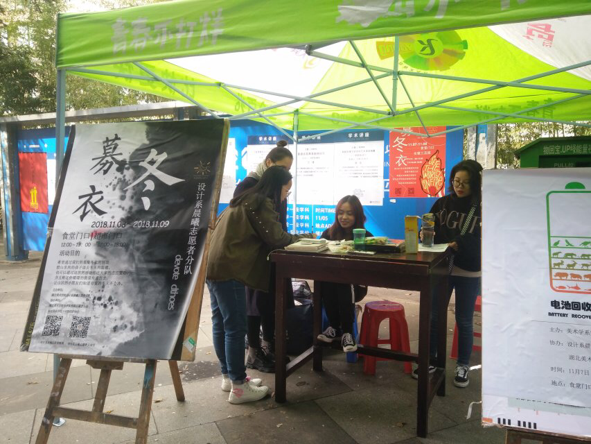 ——设计系晨曦志愿者分队募集冬衣活动圆满结束 (通讯员: 杨心怡;摄影:李金玲)继2017年慕冬衣援藏活动成功举办,2018年11月7、8两日,设计系晨曦志愿者分队在湖北美术学院藏龙岛校区内又一次开展了以“爱心传递...